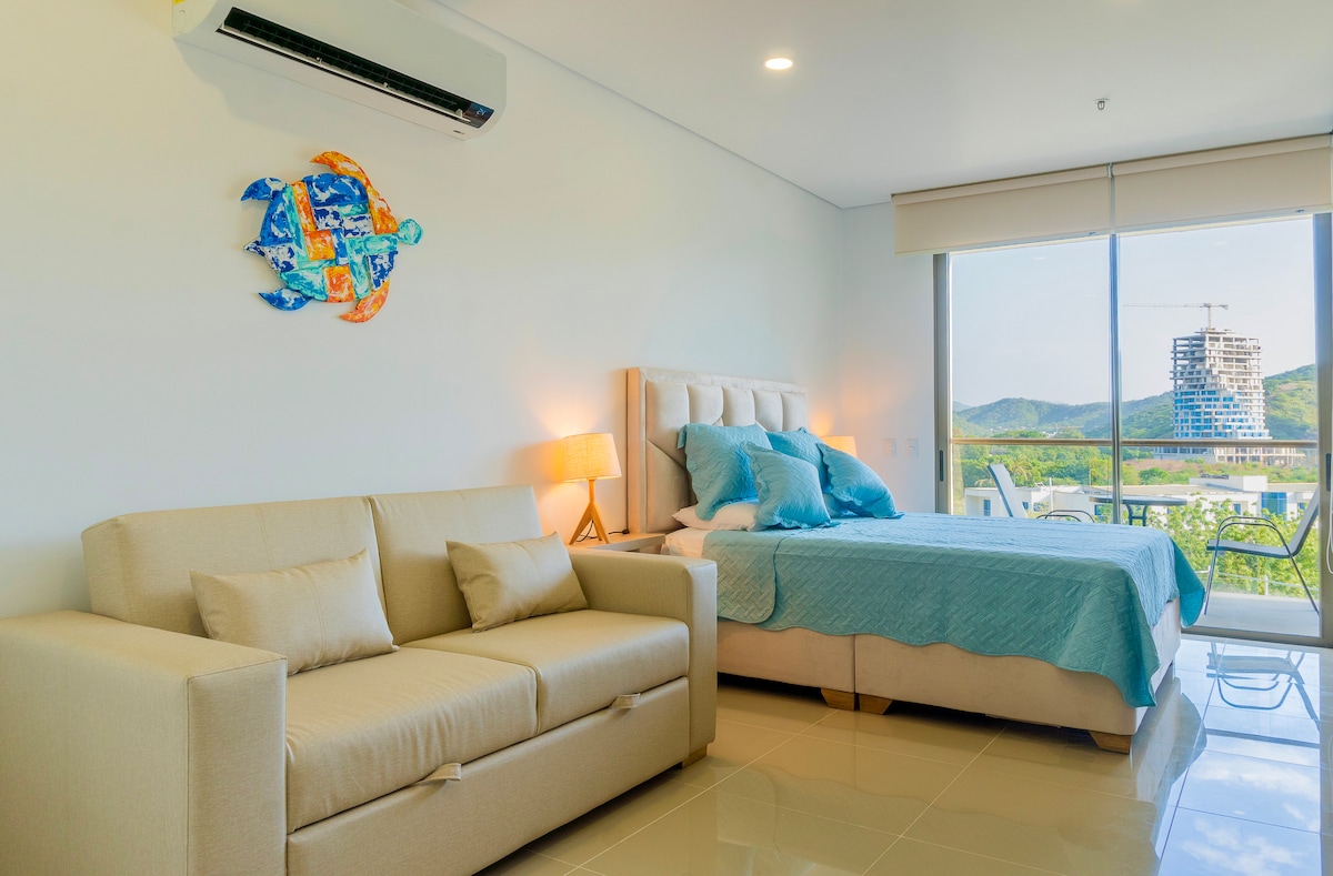 Exclusivo apartasuite nuevo ubicado en el distrito turístico en la marina de Santa Marta. Completamente amoblado, ubicado en un piso 9, diseño moderno, balcón. El apartasuite está ubicado en el mismo edificio del hotel AC by Marriot, las zonas comunes son compartidas con el Hotel: piscina semiolímpica con bar, restaurante internacional, gimnasio, spa. Espectacular vista al mar, aire acondicionado. Tiene todo lo necesario para que tengas una excelente experiencia al mas alto nivel.