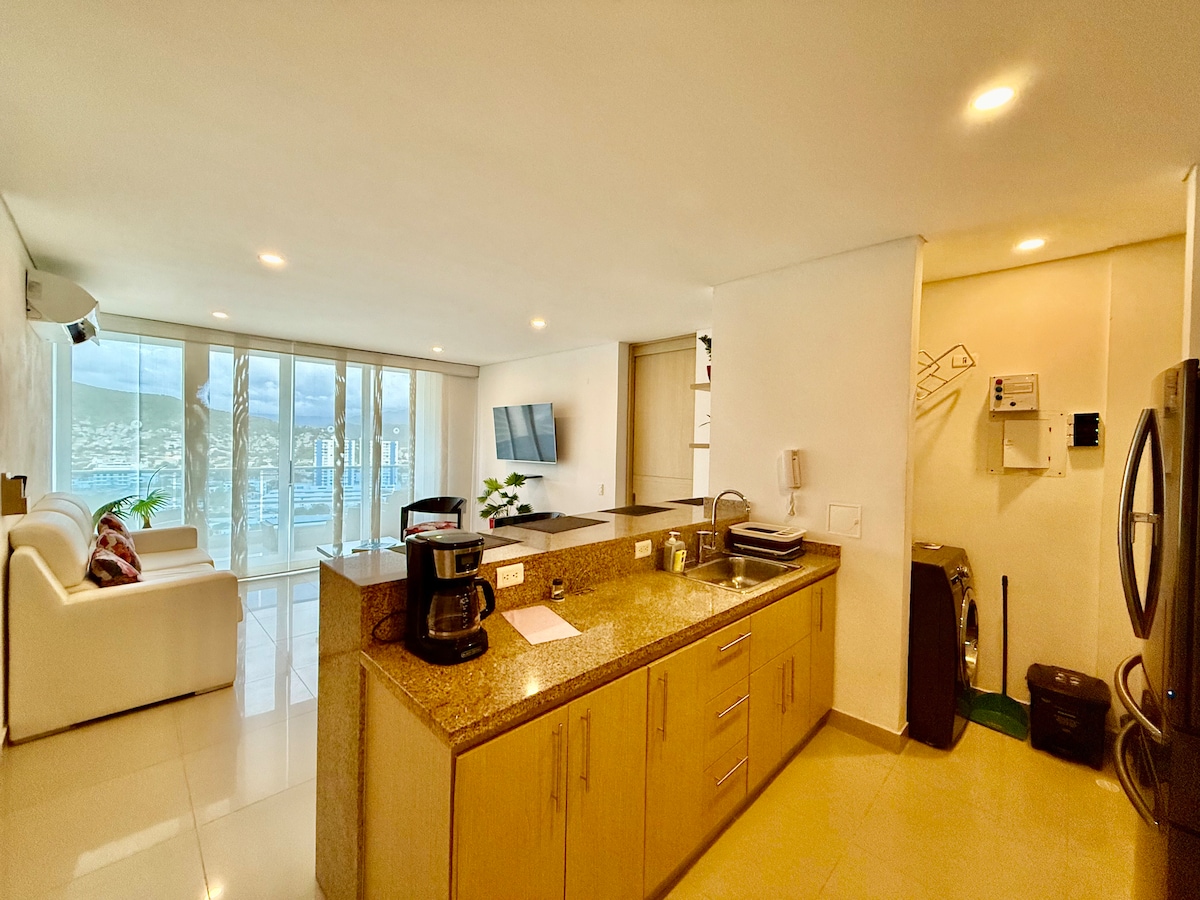 Moderno apartamento tipo loft con vista al mar a solo 100 metros de la playa en el Rodadero. Perfecto para 1-3 huéspedes con cama amplia, sofacama, cocina equipada, espacio dedicado para trabajar y baño de diseño moderno. Incluye increíbles amenidades: piscinas para adultos y niños, gimnasio completo, sauna y zona de BBQ. WiFi de alta velocidad incluido. Ubicación privilegiada cerca de restaurantes, zona comercial y atracciones turísticas. ¡Tu escape perfecto en el Caribe colombiano!