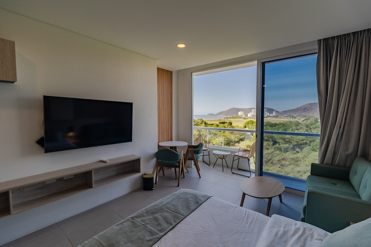 Hospédate en esta nueva suite, equipada con vista al mar y a las montañas. Ubicada en Pozos Colorados a 10 minutos del aeropuerto, el Hotel Porto Horizonte cuenta con las comodidades de un hotel de lujo. Disfruta de tres impresionantes piscinas, un moderno gimnasio y parqueadero privado. A 3 minutos del lobby te encontrarás con las tranquilas playas de Bello Horizonte. Ubicación ideal cerca al Centro Comercial Zazué, y de las tiendas D1 y Ara. No querrás irte de este lugar único.