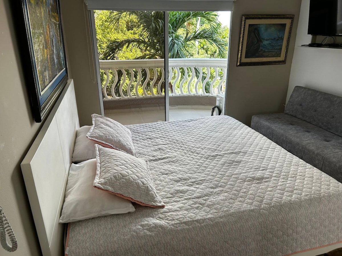 Beautiful loft in Rodadero, with private entrance to the beach, near to grocery stores, restaurants and bars. The ocean view makes of this place a magical dream where you can have fun and relax, all at the same time. Make of your vacations a trip to paradise. The resort has access to 2 pools. For the sauna and jacuzzi, you need to pay an extra fee ($12.000 C/P), and make reservations. There is a resort fee per person needs to be paid in the reception ($35.000)