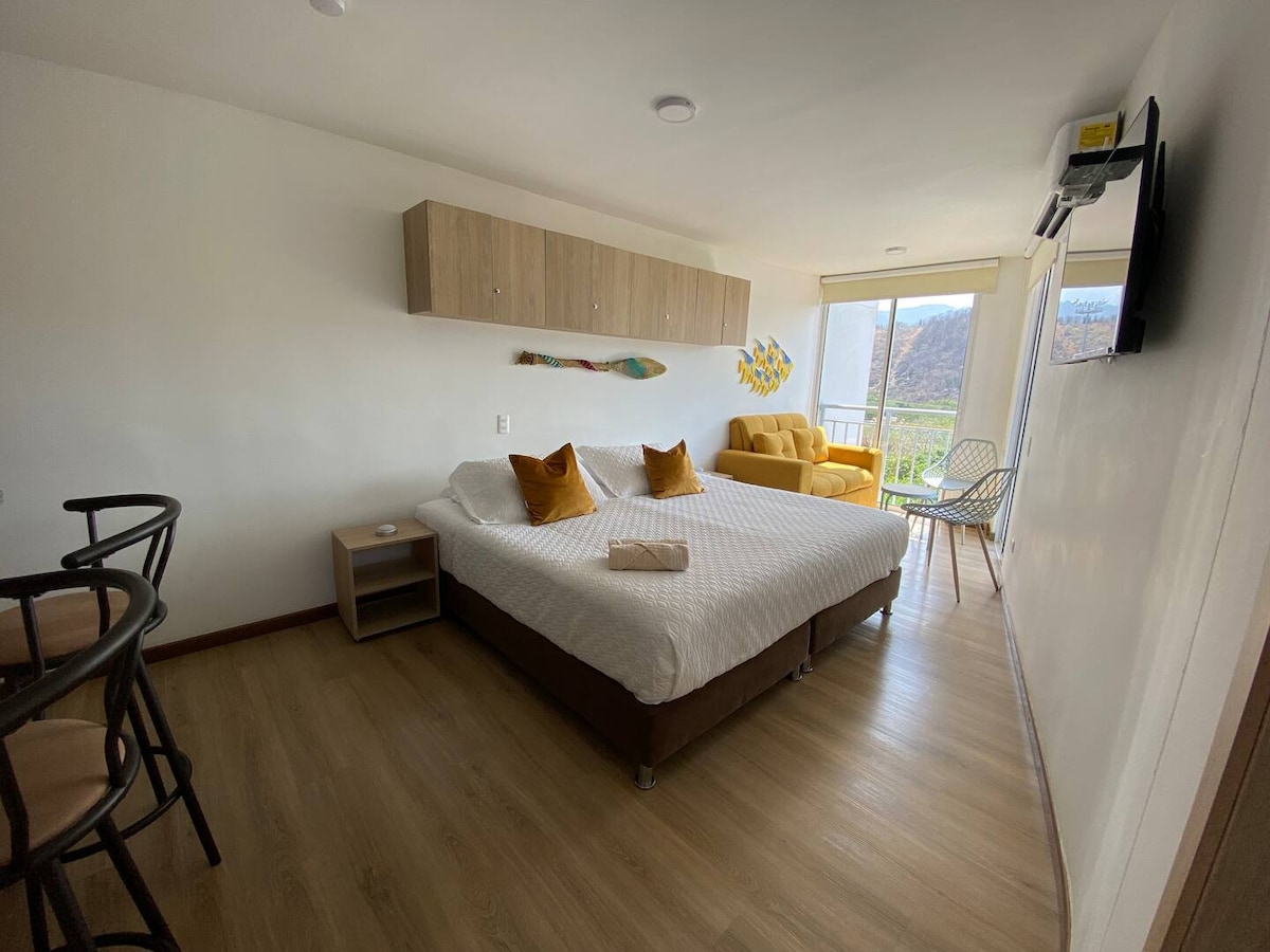 A *fully furnished modern suite* in Santa Marta just a short walk from Salguero Beach & close to El Rodadero, one of the city's most popular tourist spots. ✨ Highlights: Rooftop pool, Jacuzzis, Sauna, Turkish Bath, Game room, & Gym. MORE ⬇️. The building has free parking for visitors, subject to availability. The suite has a mountain view. Whether you're looking to unwind or explore, this suite is the perfect base for your time in Santa Marta.