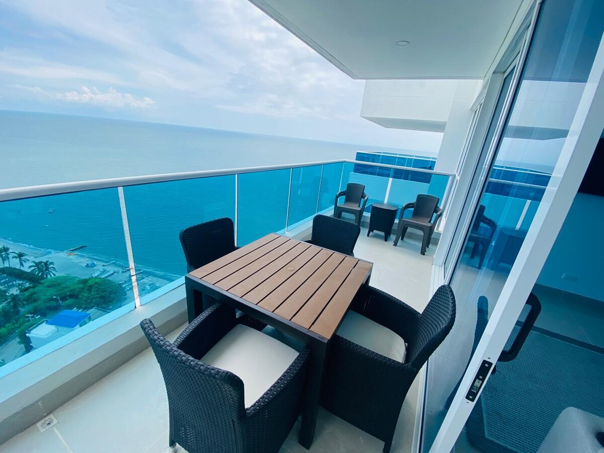 PLAYA PRIVADA PREMIUM nuevo y exclusivo APTO LUXURY. Área: 111 m2, SEGURO, Salida directa al mar, HERMOSÍSIMO, por eso todos lo elige . Parks infant: playa y acuático, Piscinas: infinita+ niños+semiolimpica+Simulador de golf+SPA+Turco+Sauna+16Jacuzzis+2bar+rest.dentro del cond. 100% AMOBLADO. Acomodación: Hab 1: cama King+Tv,Hab2: CamaQueen+nidoQueen+Tv, Hab 3: camaDoble+nidoDoble, 2baños, Sala comedor, Balcón vista al mar*Mayores de 5 años$50.000 manilla x estadía se pagan en recepción 💳 🚫🐶