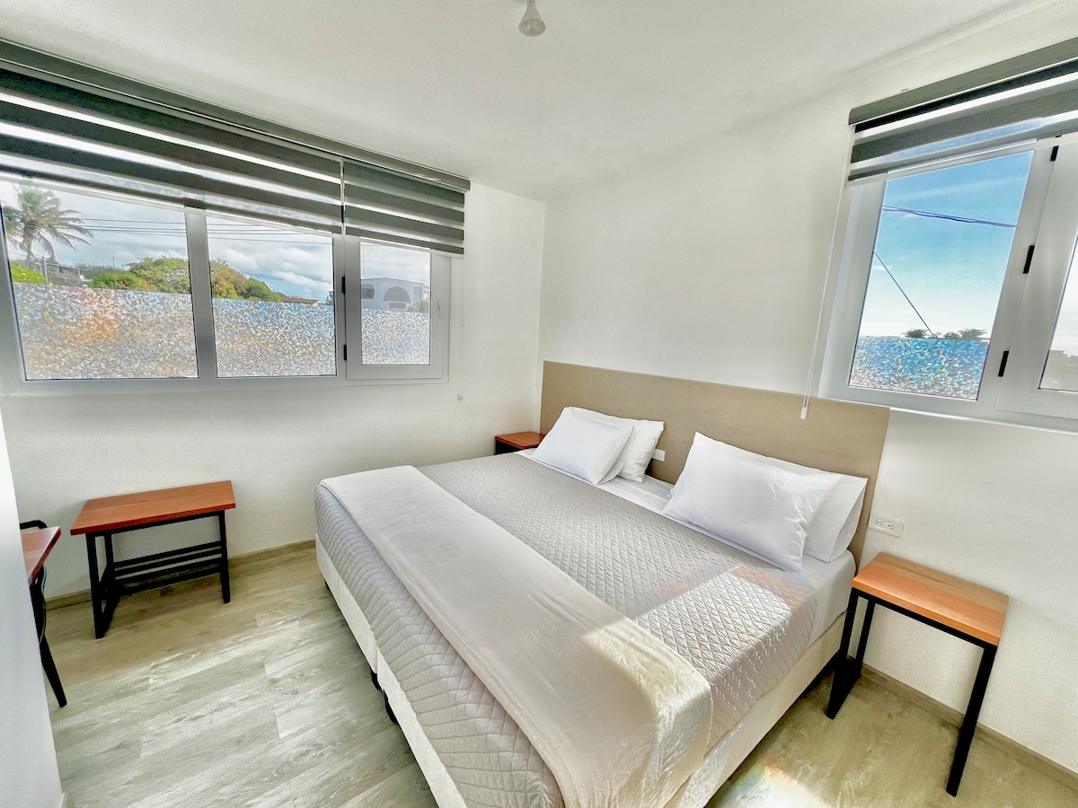 Descansa en un espacio con ventanas de doble vidrio que reducen el ruido exterior, equipado con colchones, sábanas y toallas de estándar internacional. Ubicado en Playa de Oro, en un segundo piso a pocos pasos del Malecón. cercanía a tiendas de alimentos, lavanderías, farmacias y panaderías.