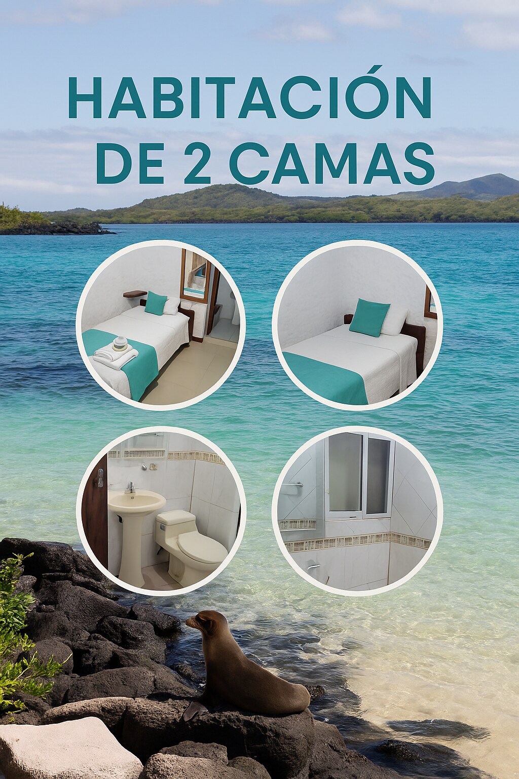 Habitación en segunda planta. La habitación cuenta con 2 camas Queen, aire acondicionado, baño privado con agua caliente y secador de cabello. Disfruta de nuestra piscina luego de tus actividades turísticas. Te brindamos agua filtrada, te y café Galapagueño free 24 horas, disponible cundo lo necesites. Nuestras tarifas no incluyen 15% IVA, por favor si eres de ECUADOR y requieres Factura comunícate con nosotros antes de confirmar tu reserva.