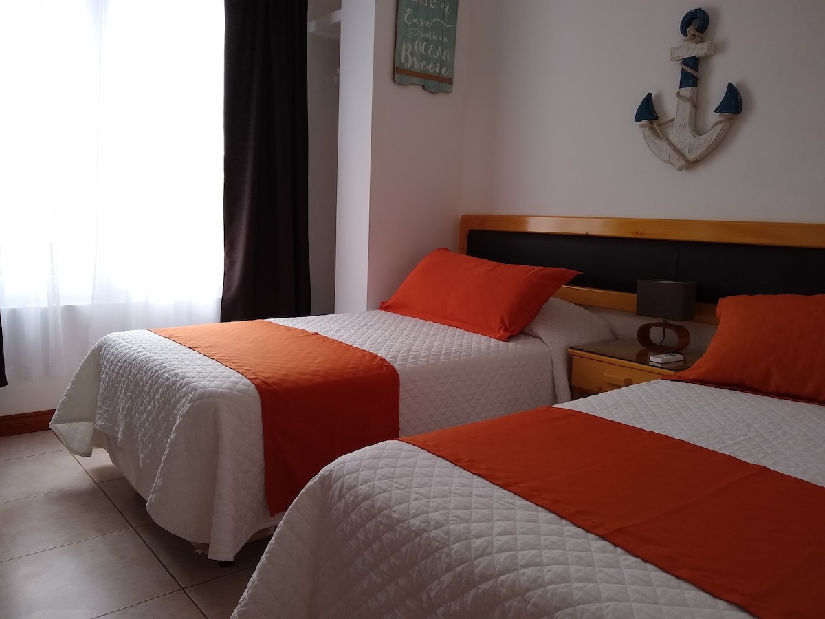 Disfruta de una habitación privada con las comodidades y servicios de un Hotel. Habitación triple en tercer piso , con 1 cama Queen y 1 cama individual, aire acondicionado nuevo, tv, baño privado con agua caliente y secador de cabello. Nuestras tarifas no incluyen 15% IVA, por favor si eres de ECUADOR y requieres factura comunícate con nosotros antes de confirmar tu reserva.