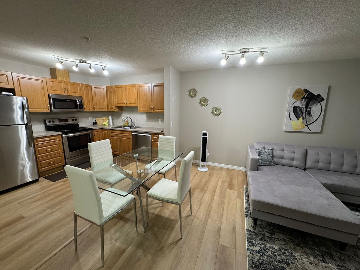 A fully equipped kitchen and cozy furnishings are perfect for longer stays. Use the pool and gym to maintain your excercise routine while you're travelling. Enjoy easy access to everything from this perfectly located home base. Take in stunning views of the city skyline from the balcony. You are just steps away from some of the city's best restaurants, cafes, and entertainment venues, walking distance to Rogers Place, MacEwan University and a quick transit to the University of Alberta.