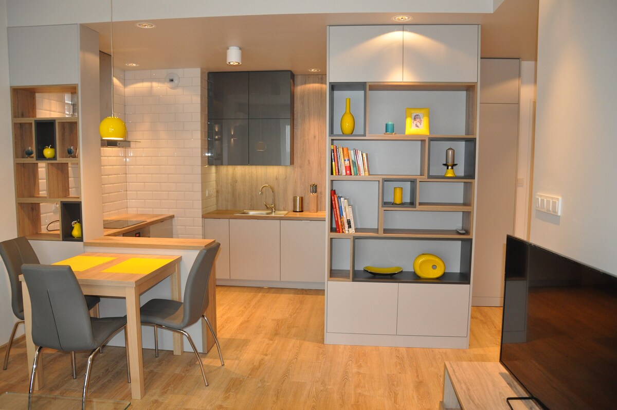 Very nice apartment. There is a kitchen with a living room, bedroom, bathroom and a balkony. Behind the building there's a small forest as well as a nice park. Around 200 m from the appartment there's a shopping mall and a cinema. For guest use there`s a undergrung car park with dedicated place. In the kitchen for comfort f guest there are basic kitchen staff like coffee, tea, sugar, salt, oil, spices etc... Night silence applies between 22.00-06.00 so it`s not adequate for parties.