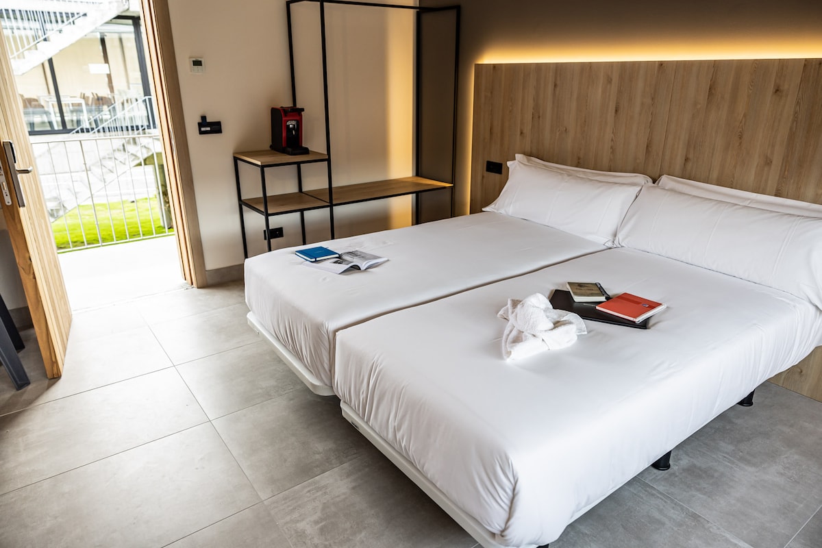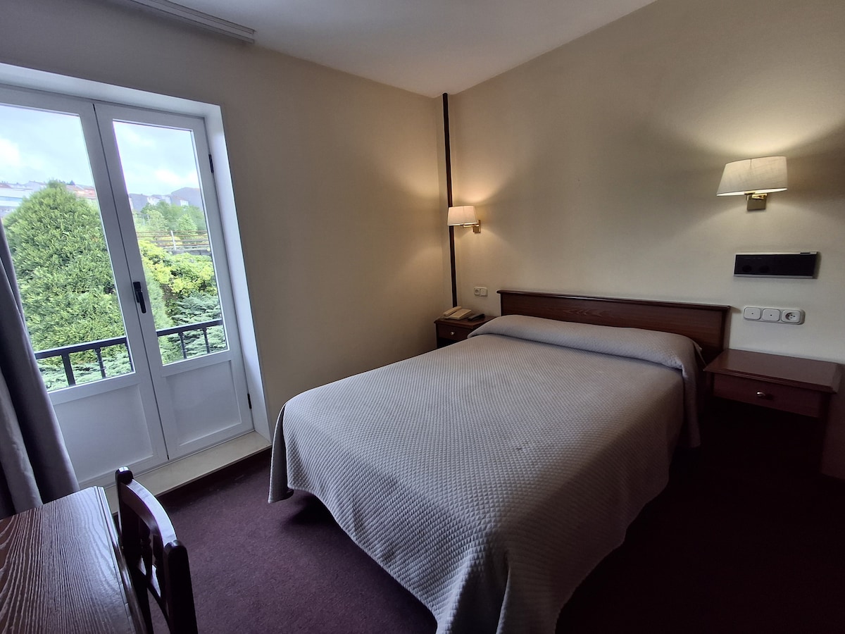 Habitación diseñada para dos personas. Ofrece comodidades y espacio adicionales, proporcionando una experiencia de alojamiento de alta gama. Cama grande de 135 cms. y comodidades modernas para una estancia confortable y relajante. Hotel rural situado en el verde campo de Galicia, a 10 km de la costa. Ofrece encanto y carácter y cuenta con una espaciosa terraza situada junto al río y con un bar-restaurante. La rústica decoración del hotel está en plena armonía con su emplazamiento..