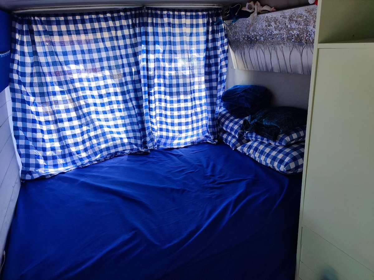 Disfruta del encanto de dormir en la naturaleza al lado del mar. Está equipada con nevera,váter ecológico, cama para dos, fregadero con 45 litros de agua, cocina de un hornillo a gas, y un mueble de almacenaje con tres cajones y mesa abatible.