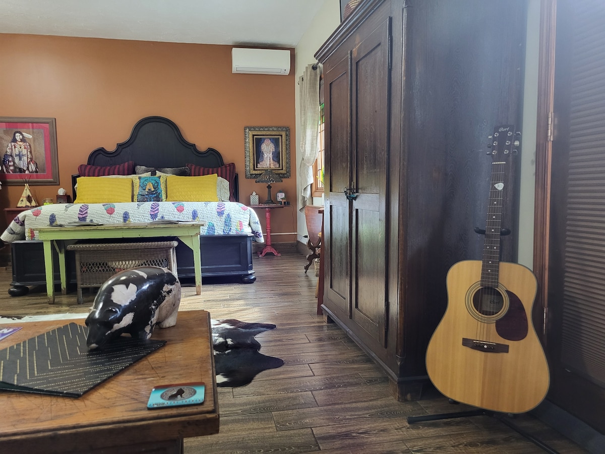HUGE AIR CONDITIONED efficiency suite features stained glass doors and windows, overlooks aspen and flowering crabapple trees. Gas burning stove for cozy nights as you cuddle in the king size bed. Washer and dryer and ensuite bathroom. Close to airport and ski hill.Handicap accessible. Outside eating area and gas grill. Blackout privacy blinds and tiled floors throughout. Edge of town with country feel. Walking distance to breweries and East Gallatin River and cherry creek fishing access.