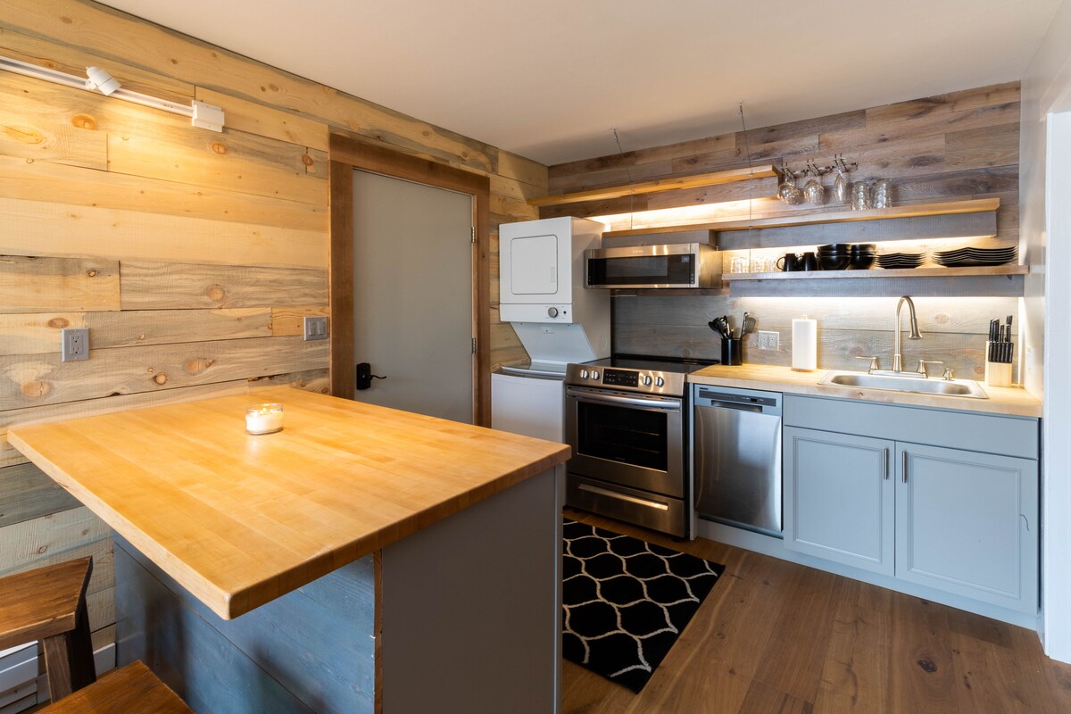 This 2 bedroom, 2 bathroom condo features 180-degree views of the Bridger Mountains. The oversized north-facing window baths the room in natural light. It has a full kitchen, living area, 1 king bed, 1 bunk bed, 2 full baths, walk in closet, and laundry. Outdoor roof top entertaining space for guests. The condo is upstairs from Ponderosa social club, Ceremony salon and spa, and Bourbon BBQ. Walking distance from lots of local favorites including Freefall Brewery, The Elm, and Access Fitness.