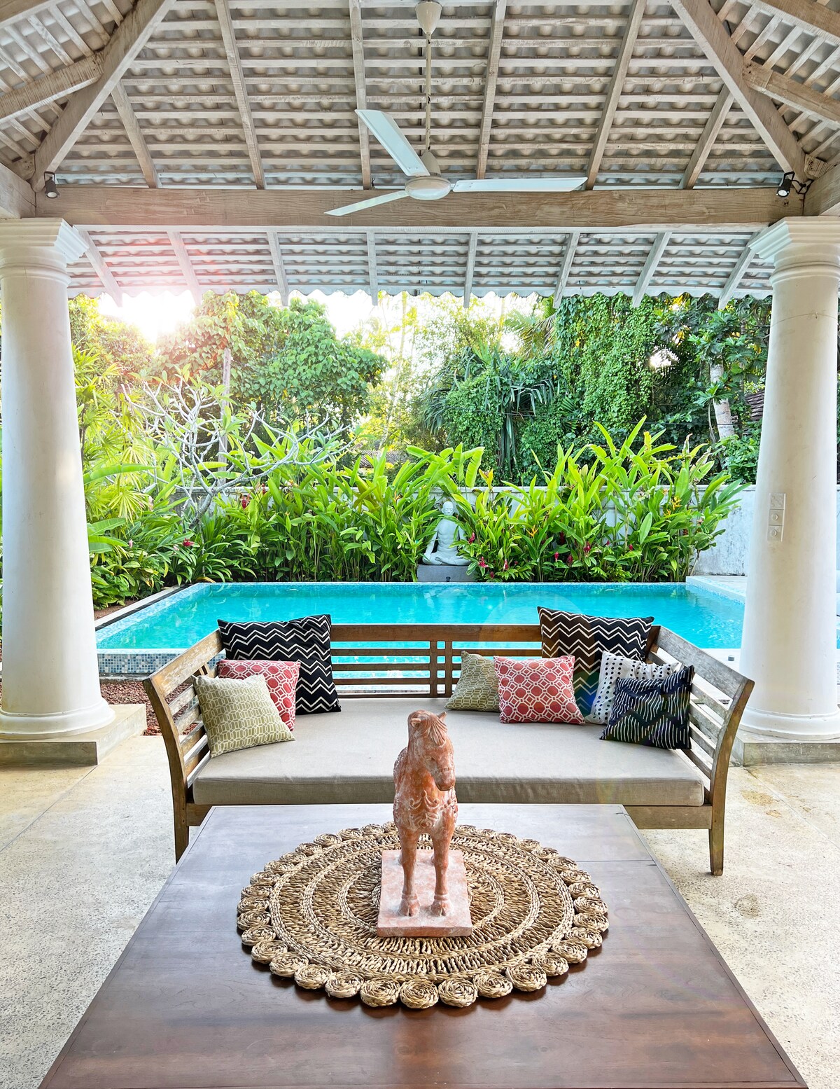 Unser stilvolles Zimmer in Ahangama bietet eine perfekte Mischung aus modernem Komfort und tropischem Charme. Mit einem gemütlichen Kingsize-Bett, einem eleganten Badezimmer mit Regendusche und einer privaten Terrasse mit Blick auf den Garten und den großzügigen Pool ist es der ideale Rückzugsort. Natürliche Materialien und ein helles, luftiges Design schaffen eine entspannende Atmosphäre – perfekt, um die Schönheit Sri Lankas zu genießen.
