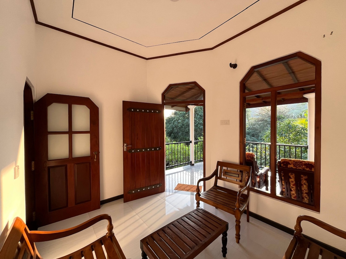 Retreat to your private balcony to watch the sunset over mountain peaks. We provide binoculars so you can spot monkeys in the trees or kingfishers in the garden. This entire first floor is yours: private entrance, kitchenette, and King, Double & Single beds. Nature’s Touch We even preserved a tiny rainbird’s nest in the bathroom corner during renovations—a tribute to our shared home with nature! Note: No AC, but powerful fans and garden breezes create a cool, peaceful sanctuary.