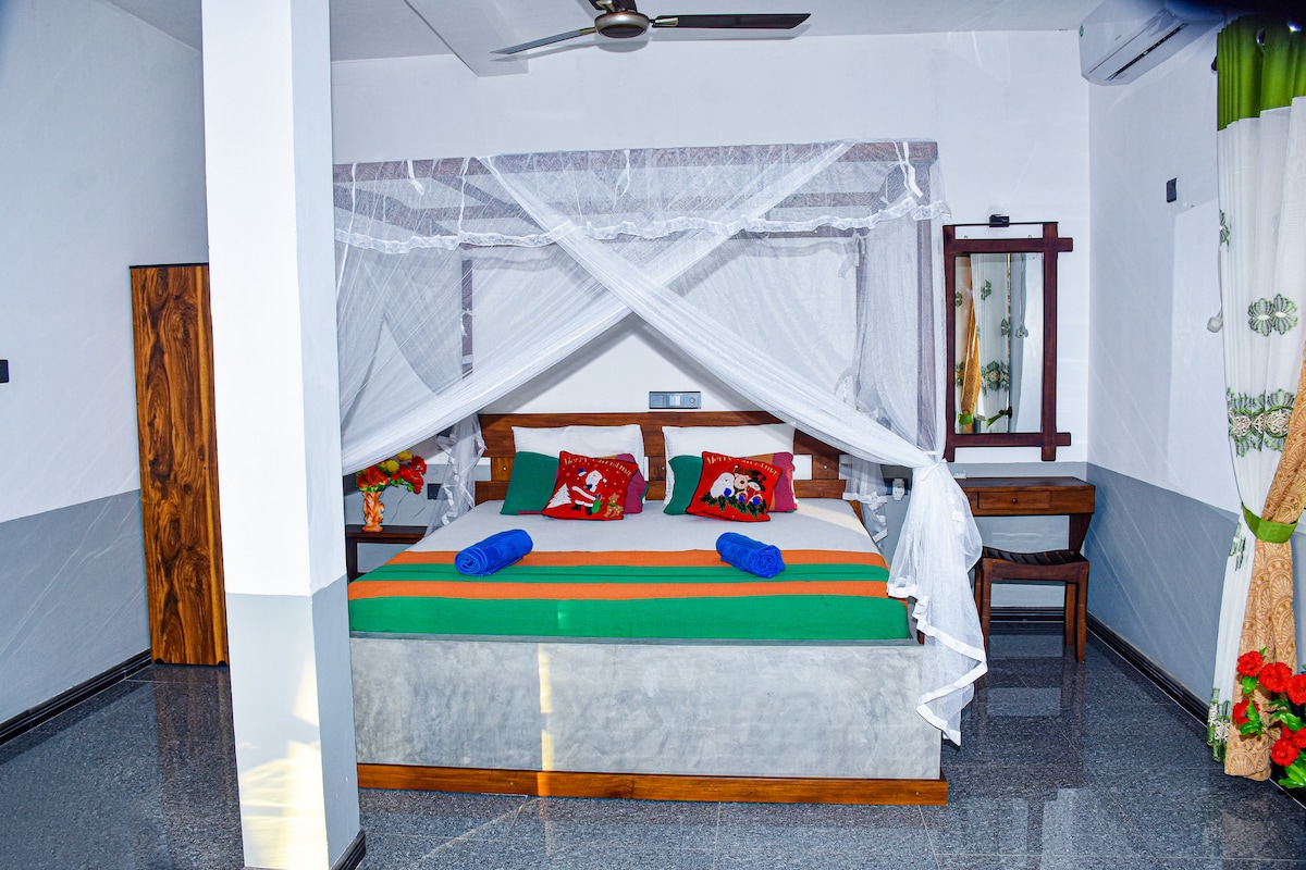The guesthouse is located in Hikkaduwa, 300m away from Narigama Beach, surrounded by nature. The guesthouse provides a well equipped kitchen with fridge, stove, oven, toaster and kettle and also a terrace with dinning area.The guesthouse provides air-conditioned rooms, with fast Wi-Fi, mosquito-net, wardrobe, ceiling fan, cloth drying rack, dressing table with mirror, private bathroom with shower and hot water. All the rooms are fitted with bed linen and towels and have balcony.