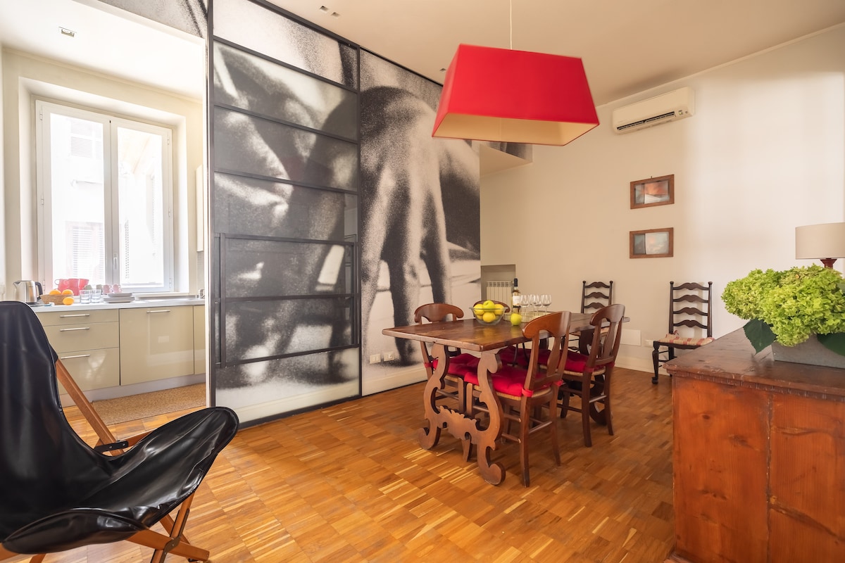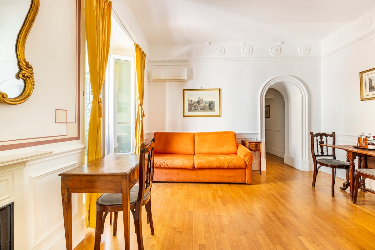 Our luxury apartment is located a stone's throw from the famous Spanish Steps, the Trevi Fountain and the most elegant shops in the world on via Condotti. Admire the mix of ancient and modern: original 18th century beams and fine antique furniture alongside contemporary comforts and furnishings. Have a coffee on the golden sofa and then go to discover Rome.