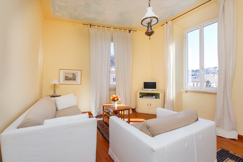 In the center of Rome a private penthouse open louvered window coverings in a living room to maximize light and reveal wraparound views of Central Rome and St peter's basilica. A period fireplace, terra cotta tiles create a traditional feel. Private terrace fully furnished. Two double bed rooms. Ten minutes walk from St Peter's square and Vatican Museums. Overlooking Rome and St Peter's. 2 minutes walk to public transportation, bus & metro will take you easily to all the main historical sites.