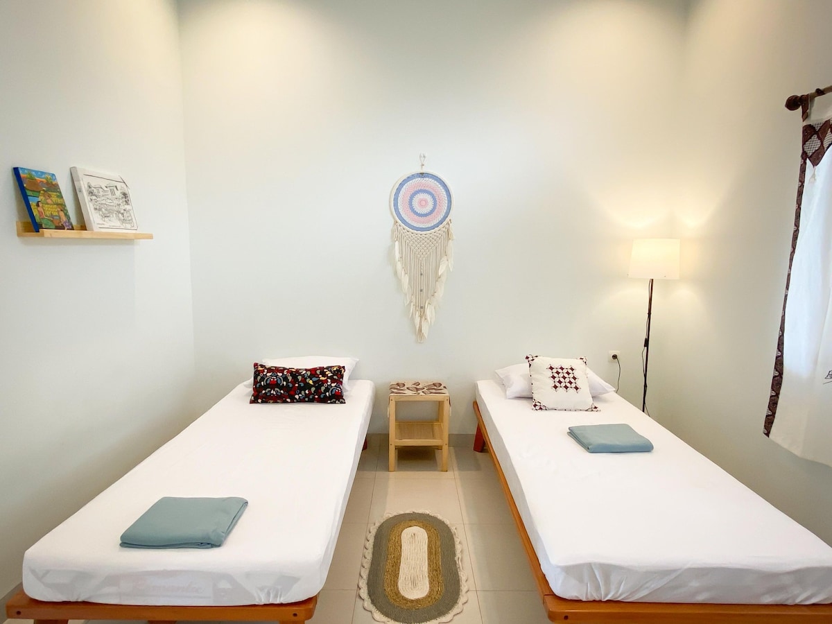 Kom met het hele gezin tot rust in deze vredige accommodatie. 7km rijden dan ben je op het strand, mooi strand met zwarte zand en grote golven. verse vis eten voorbereid door lokale kok. 4km rijden kom je in een heuvel met dennenbos en prachtig uitzicht. Je kan de zonsopkomst genieten vroeg in de ochtend. Ons huis staat in Bantul, Jogjakarta. 20km van Malioboro en Jogjakarta trein station.