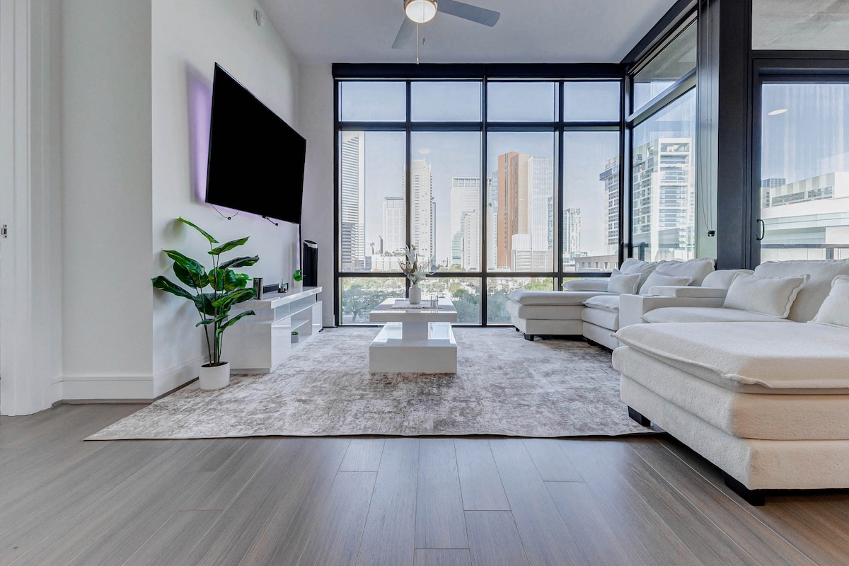 WIDE OPEN SPACE (3 STORY 2600SF) 24/7 Self check-in Amenities: 20ft floor to ceiling windows 120" projector Hi-speed wifi 2nd Story Balcony overlooking Downtown Big Chef's Kitchen Make a cocktail in the minibar and swing in an oil barrel while watching the sunset over downtown. Walk to Minute Maid, Toyota Center, PNC Stadium, Discovery Green, Hilton Americas & George R. Brown Convention Center in minutes! Enjoy attractions like 8th Wonder Brewery, Graffiti Park, Chapman & Kirby + many more!