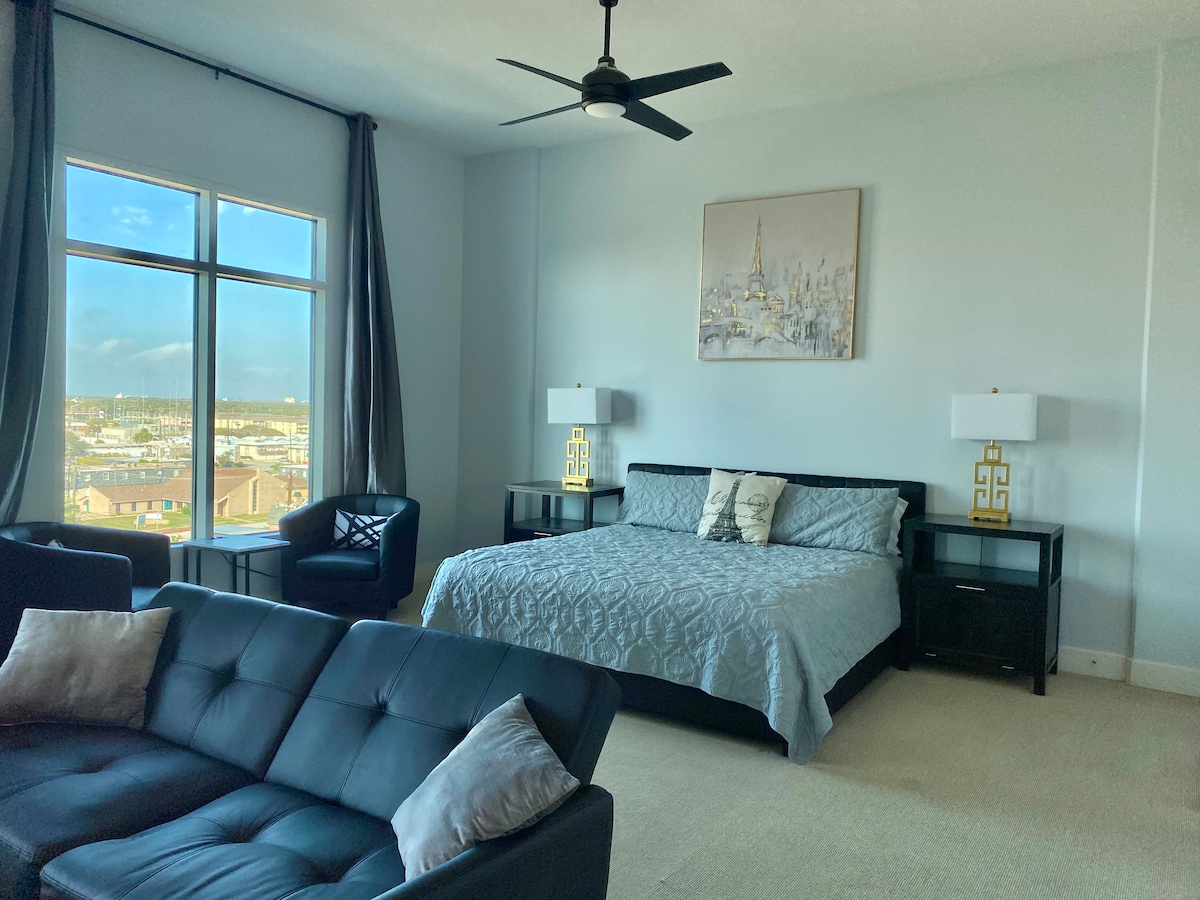 The Modern Chic is a curated luxury unit offered by The High Rise Collective in Houston. This stunning 2 bedroom 2 bath high rise apartment offers a professionally designed interior with luxurious amenities such as an infinity edge pool, spacious gym, and much more. Located in the heart of the Texas Medical Center, this unit offers direct access to the Buffalo Bayou running trails. There is also easy access to Rice University, The Houston Zoo, Hermann Park, Museum District, and NRG Stadium.