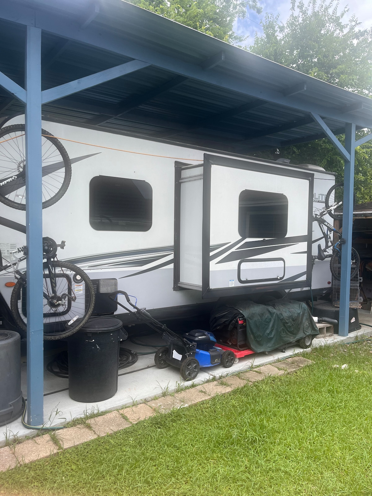 Beautiful new camper. Very clean. Large cover over camper and large concrete pad. The cover will provide some relief during the Texas heat and a cover for any rain. Fish and crab right out the back door.There is a brand new 10 x 16 and 10 foot high deck to go out on and watch the barges, pelicans,shore birds and the sunsets! The site has a fire pit with a grill on top of it to cook on. Pull your boat up to the back of the campy.Queen size bed when you are ready to turn in!