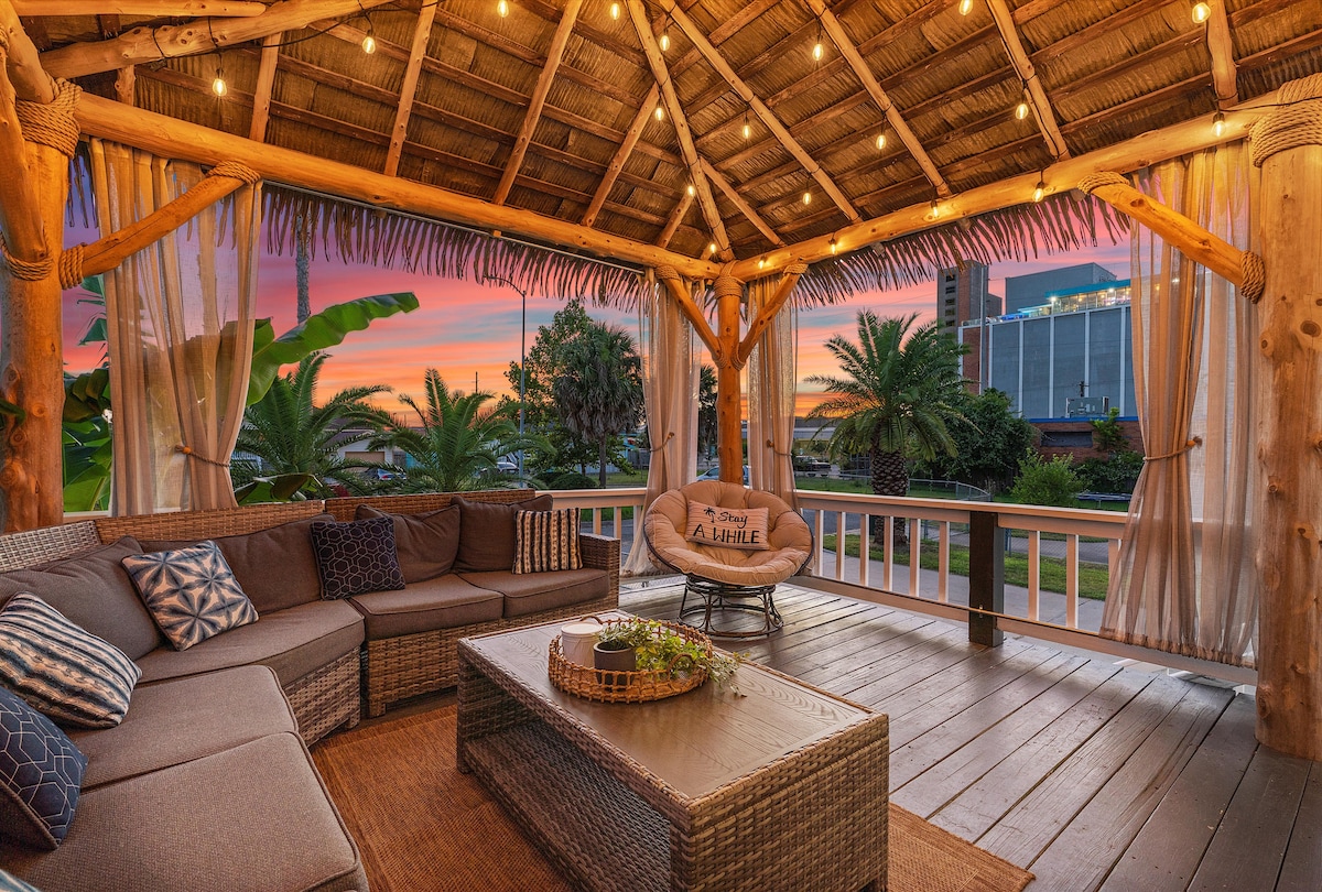 -Casita De Palmera- Relax on the lighted, palapa-covered deck with your coffee or cocktail! Family + pet friendly! Less than a half mile to Galveston's Historic Downtown area and a short 4 minute drive to the beach! Close to all of the fun, shopping, live music and restaurants on The Strand! -Fenced backyard -800+ MBPS Wifi -4 Smart TVs w/ Roku capability to stream with your accounts -Arcade & board games -Wood Grill -Beach towels & toys Close to cruise terminals & ONE block to cruise parking!