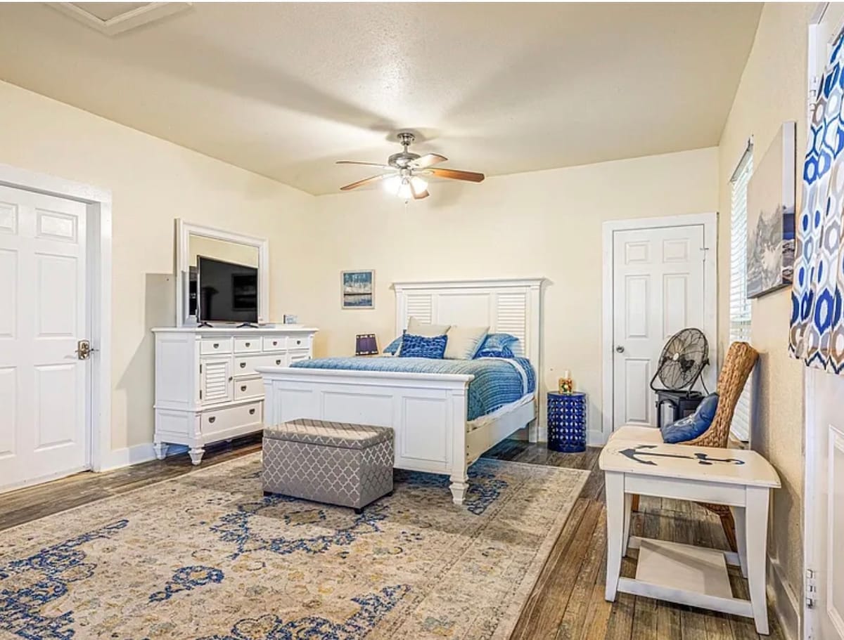 This open concept 1200+ sq foot studio suite encompasses the entire 2nd floor of the Roomers House, with amazing views of the gulf, pleasure pier and seawall blvd. This suite features a full kitchen, amazing bath (with large walk in shower), washer/dryer, 65” TV with Hulu Live TV, adjustable Mini Split HVAC, high speed Wi-Fi, two private decks, assigned private parking & sleeps up to 4 with two pillow top king sized beds.