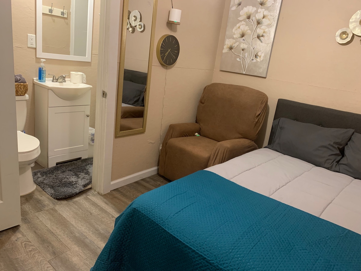 Check-in starting 4p Early check-in options: 3p $10 2p $15 1p $20 12p $25 Check-out by 11a Late check-out options: 12p $10 1p $15 2p $20 3p $25 Please set your guest count for correct pricing. PRIVATE ENTRY Pictures 2-9 - bedroom w/ Cali King sized bed, 65” smart TV, bathroom w/ 2 vanities, soaking tub w/ jacuzzi jets, walk-in shower, large walk-in closet (doubles as small room w/ twin bed - ask), are all privately your area. Other pics show common area