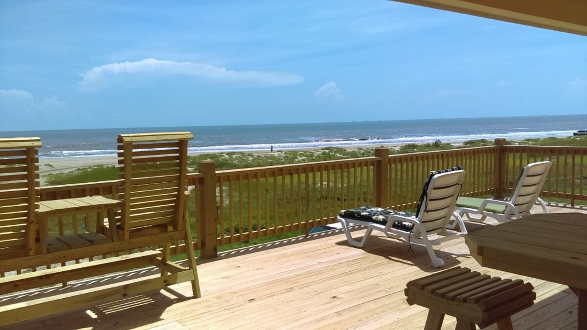 Relax with the whole family at our sturdy & newly renovated beach home, located steps away from the beach. Our large home is situated on an expansive corner lot & features beach and bay views. Enjoy listening to the ocean waves & stunning sunsets while you sip coffee or wine from our oversized deck. Enjoy s’mores from our outdoor fire pit. Our home is not a typical Galveston AirBNB as it is our family’s vacation home and very well maintained.