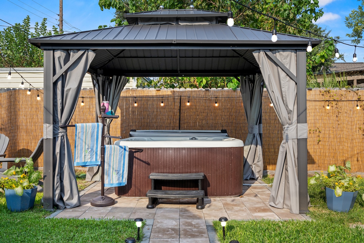 Great location resort-like amenities: Pvte pool & 7 per. Spa, landscaped yard with comfortable furniture & 10 seat dining table under 12x14 Gazebo, and gas grill. 12x14 gazebo pvte social area @ pool. 2 min walk 2 Beach, Suprmrkt, Rests, Htls & Convention Cntr. Renovated & decorated with tropical, coastal modern decor. Welcoming & relaxing atmosphere with access 2 all island attractions @ your fingertips. Home is fully stocked with linens, towels, toiletries, appliances, n spices.