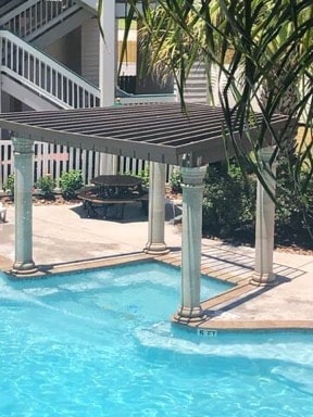 Great location resort-like amenities: Pvte pool & 7 per. Spa, landscaped yard with comfortable furniture & 10 seat dining table under 12x14 Gazebo, and gas grill. 12x14 gazebo pvte social area @ pool. 2 min walk 2 Beach, Suprmrkt, Rests, Htls & Convention Cntr. Renovated & decorated with tropical, coastal modern decor. Welcoming & relaxing atmosphere with access 2 all island attractions @ your fingertips. Home is fully stocked with linens, towels, toiletries, appliances, n spices.