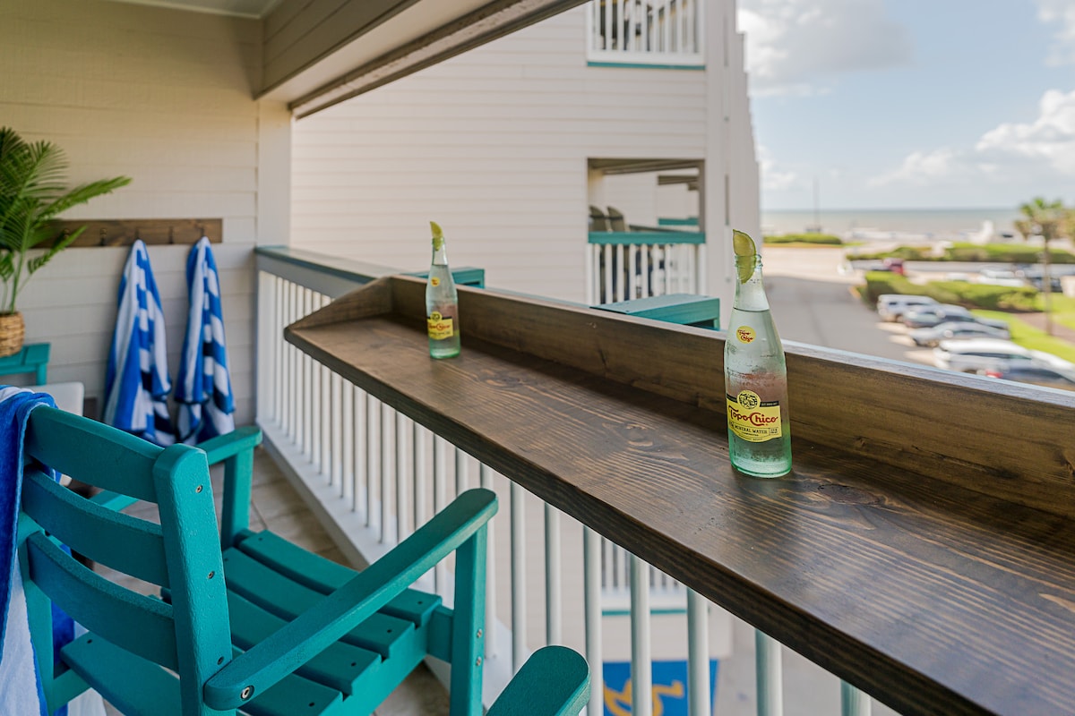 This beloved beachfront corner studio condo between Stewart Beach and East Beach has a large balcony and expansive gulf views. It is well-appointed for two or for a solo retreat. Resort offers pool and pickleball! No street to cross to get to the beach, yet the condo is close to downtown Galveston and the Seawall. Enjoy the gorgeous sunrises and moon gazing, track cruise ship comings-and-goings, check out the activity on the beach, float in the heated pool, or relax and watch the waves!