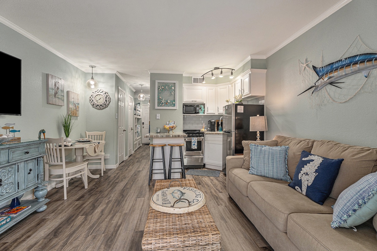 This condo is very comfy and perfect for a relaxing getaway to Galveston 1.5 BLK to BEACH @ 23rd/Seawall and also close to The Strand/Cruise terminal.Safe neighborhood Updated 1/1 ENTIRE apt on 1st floor Private fenced patio with BBQ grill.PET FRIENDLY. No Pet Fee Fast WIFI/Central AIR/HEAT. 65" Smart TV Free street parking Fully stocked kitchen for the chefs out there although you can walk to many restaurants and bars EASY Checkout where we take care of everything- No chores for you.