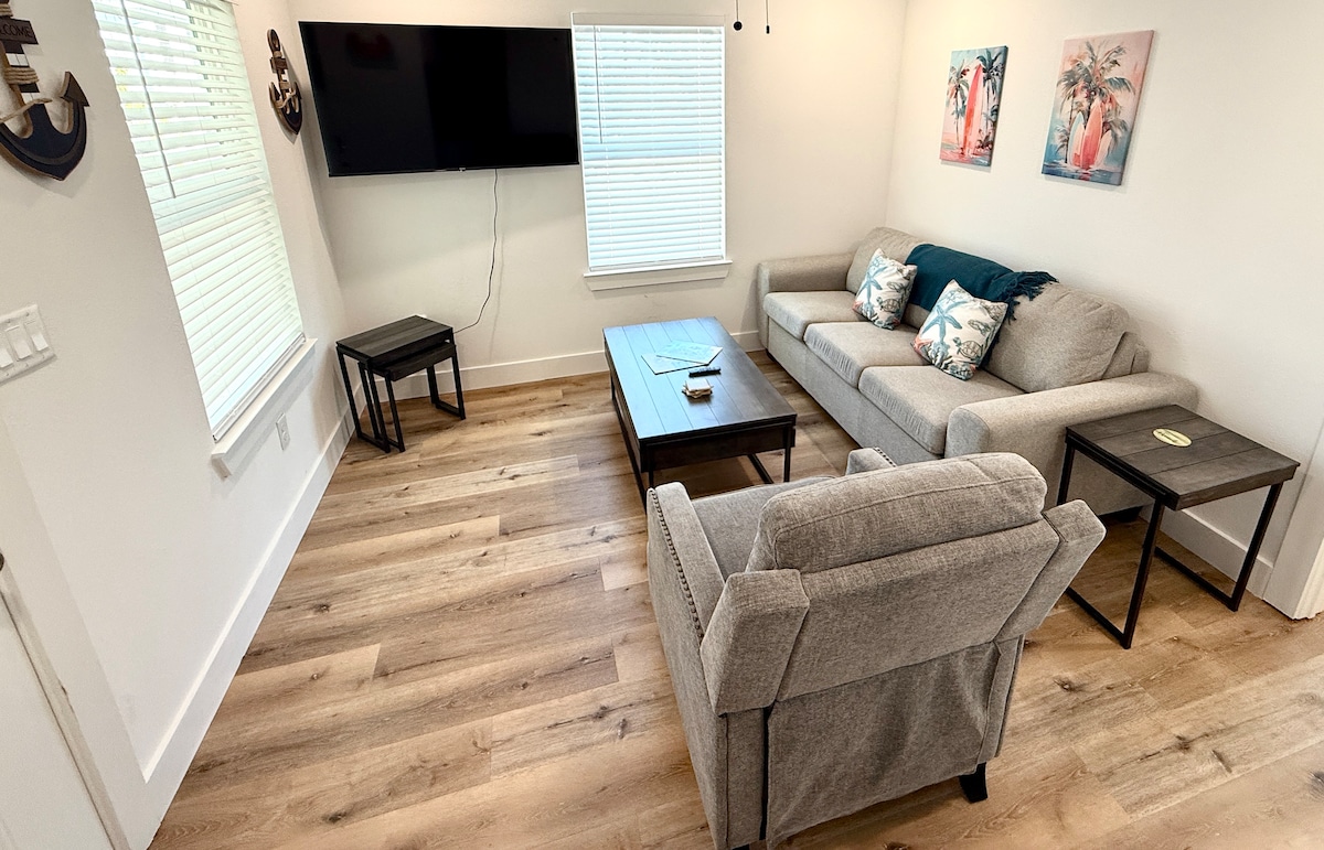 AS SEEN ON TV. Find this gem on Restoring Galveston. Newly renovated 927 square foot home nestled amongst the mature trees in Galveston's Midtown. When you enter this historic beach cottage you will immediately feel at home and relaxed. 50" TV in the living room and 43" TV's in the bedrooms offering Netflix, Youtube TV and Disney+. So many extras including a cowboy pool, life size chess set, fire pit, beach chairs, umbrella, heated toilet seats and off street parking just to name a few.