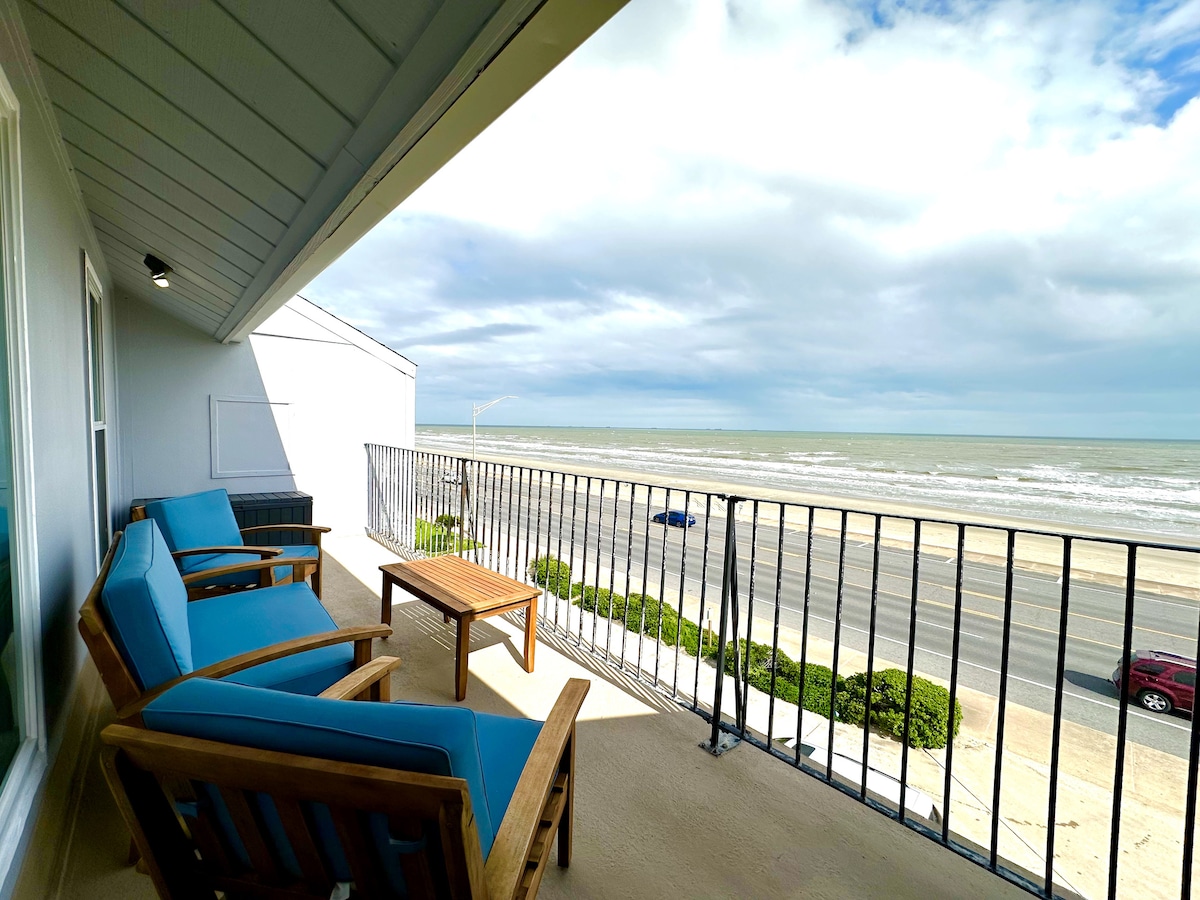 This newly renovated Beach front condo is the perfect place for your friends and family to stay in Galveston. The unobstructed view of the ocean from your private top floor balcony is breathtaking. The interior is modern, spacious and full of natural light. Intentional design, new renovations and simple pops of color make this space calming, clean and inviting. You cannot beat this location in regards to proximity of attractions and just a walk across the street to the beach!