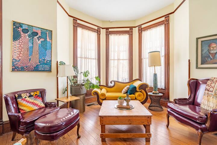 This is the only downstairs guest room in a multi-room historic guest house. No stairs to climb (except for the front porch stairs) and it's just steps from the kitchen, coffee bar, and back garden. It features an antique queen bed, blackout shades, a vintage leather Chesterfield sofa, and a flat-screen TV. There’s also an antique vanity and dresser, plus a private ensuite bathroom with classic black-and-white tile and a walk-in shower.