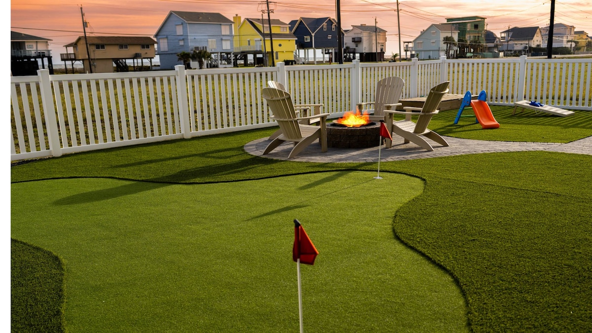 Escape to a coastal retreat just 500 feet from the beach, blending luxury and relaxation. Unwind in the private heated pool and spa, challenge friends on the mini golf putting green, or gather around the firepit. The fully equipped kitchen makes dining easy, while the poolside bar keeps drinks close. Stay connected with ultra-fast Wi-Fi. Scan the QR code in photos for a 3D walkthrough. Book now and get 25% off Beachin' Rides Golf Rental!