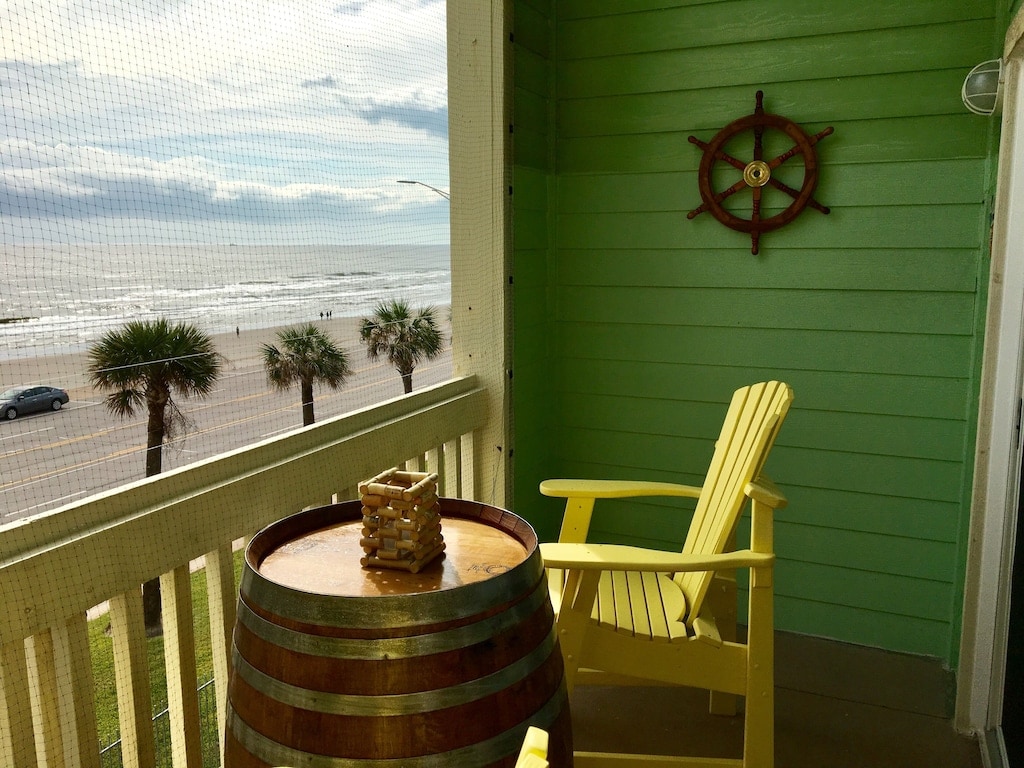 This beloved beachfront corner studio condo between Stewart Beach and East Beach has a large balcony and expansive gulf views. It is well-appointed for two or for a solo retreat. Resort offers pool and pickleball! No street to cross to get to the beach, yet the condo is close to downtown Galveston and the Seawall. Enjoy the gorgeous sunrises and moon gazing, track cruise ship comings-and-goings, check out the activity on the beach, float in the heated pool, or relax and watch the waves!