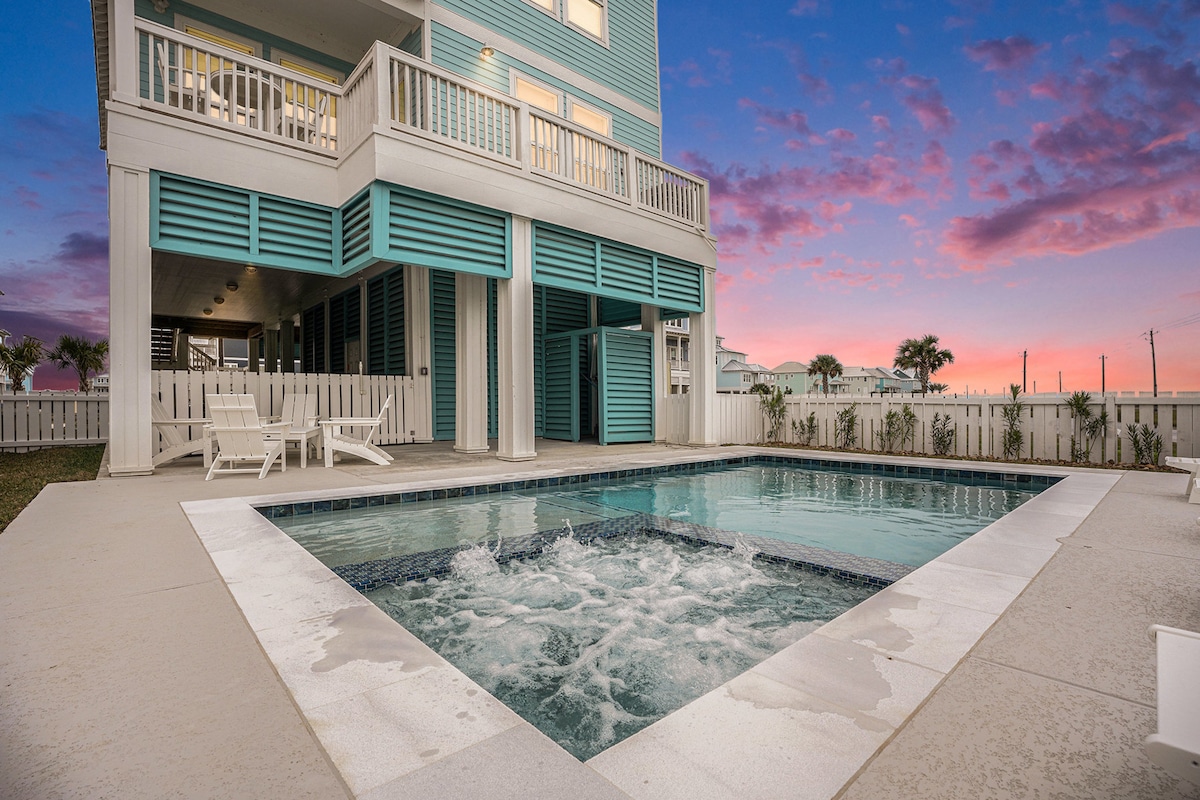 Pack up & come play in this beautiful beachhouse located on the "Main Street" canal in Sea Isle, Galveston. Just minutes away from the beach, marina, park, & pier, this home features fun activities, one of which is swimming with the “dolphins” in our sparkling pool. Other fun stuff include a ping pong, foosball, & dual basketball tables plus a double seated kayak & charcoal grill. Guests will enjoy day or night fishing as one of the best ways to unwind or relax upstairs on the lit deck at dusk
