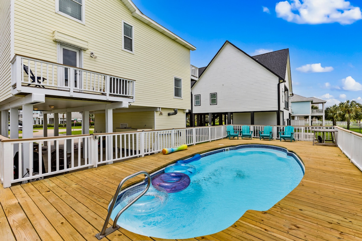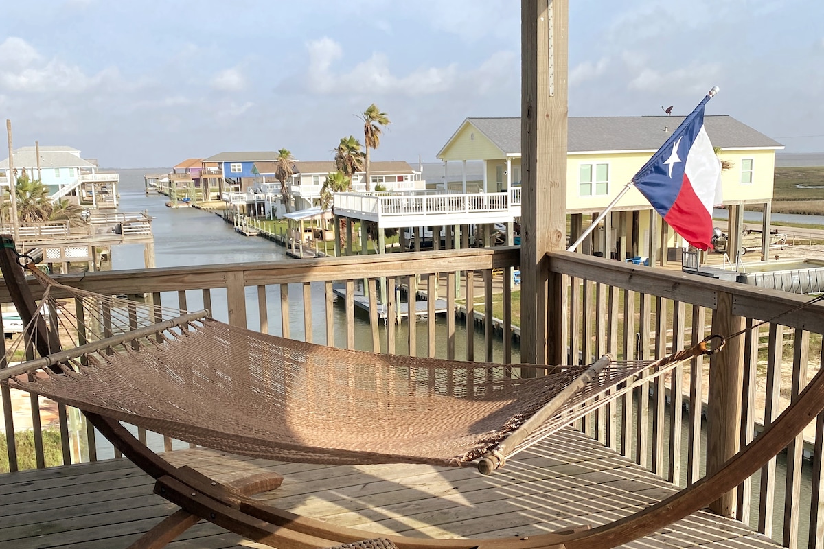 RELAXING, NEW BEACH HOME 1. mi Beach, SUNSET patio bay views, salty ocean breeze's, 4 free parking, pellet grill, playroom, dining space & outdoor shower. Families Welcomed, gated, covered patio & gated backyard, GARAGE-PLAY-ALL-DAY PLAYROOM- Pop-a-shot, corn hole, ping-pong, Pellet Grill, Covered Patio, ground floor shower. BEACH less than 5 Minutes to the Island's best attraction's, Seawall Blvd Restaurants, Bars, Pleasure Pier, Moody Garden's Golf Course, Fishing Pier, coffee cafe.