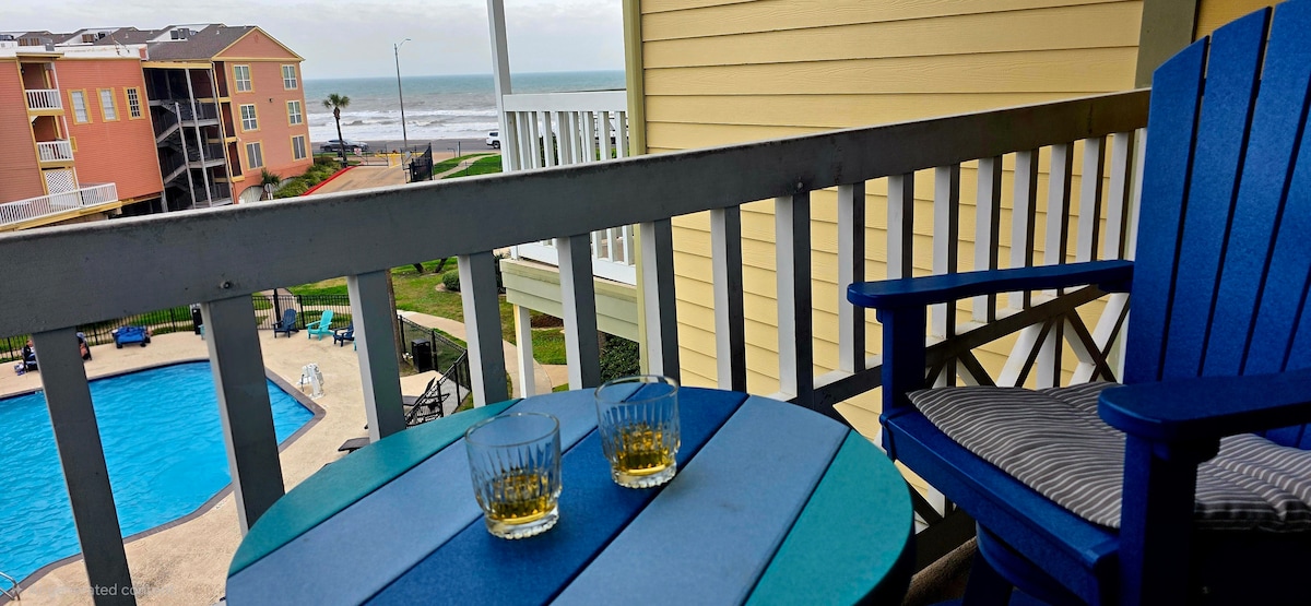 This beloved beachfront corner studio condo between Stewart Beach and East Beach has a large balcony and expansive gulf views. It is well-appointed for two or for a solo retreat. Resort offers pool and pickleball! No street to cross to get to the beach, yet the condo is close to downtown Galveston and the Seawall. Enjoy the gorgeous sunrises and moon gazing, track cruise ship comings-and-goings, check out the activity on the beach, float in the heated pool, or relax and watch the waves!