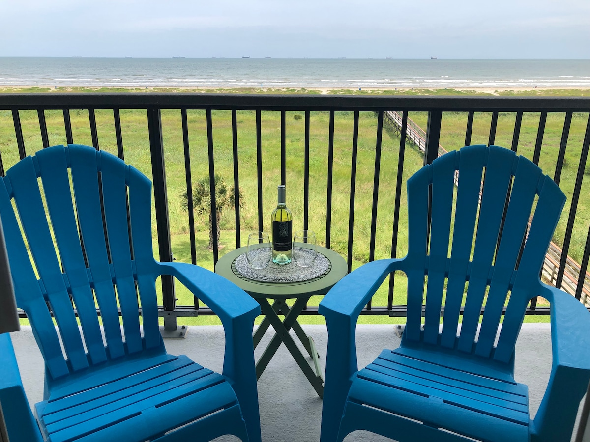 This open concept 1200+ sq foot studio suite encompasses the entire 2nd floor of the Roomers House, with amazing views of the gulf, pleasure pier and seawall blvd. This suite features a full kitchen, amazing bath (with large walk in shower), washer/dryer, 65” TV with Hulu Live TV, adjustable Mini Split HVAC, high speed Wi-Fi, two private decks, assigned private parking & sleeps up to 4 with two pillow top king sized beds.
