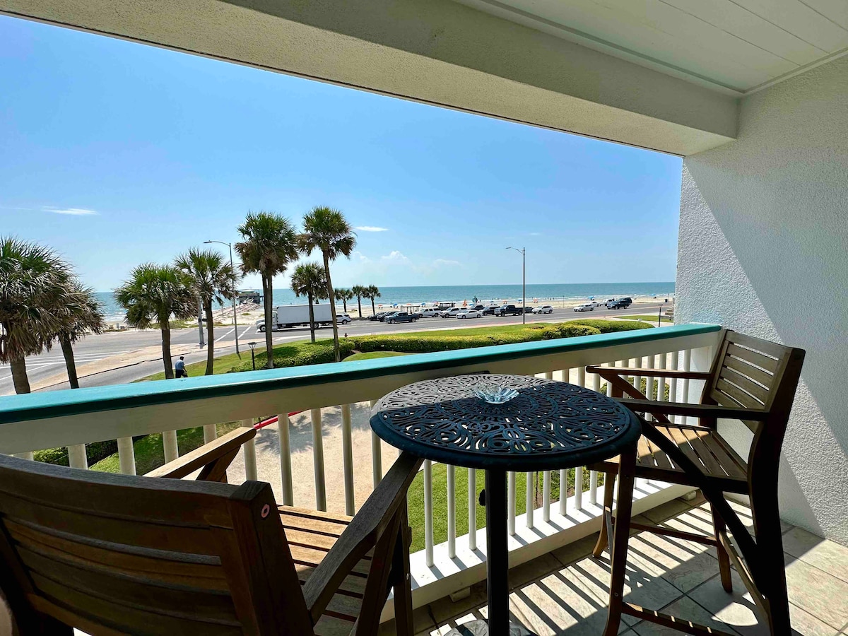 This beloved beachfront corner studio condo between Stewart Beach and East Beach has a large balcony and expansive gulf views. It is well-appointed for two or for a solo retreat. Resort offers pool and pickleball! No street to cross to get to the beach, yet the condo is close to downtown Galveston and the Seawall. Enjoy the gorgeous sunrises and moon gazing, track cruise ship comings-and-goings, check out the activity on the beach, float in the heated pool, or relax and watch the waves!