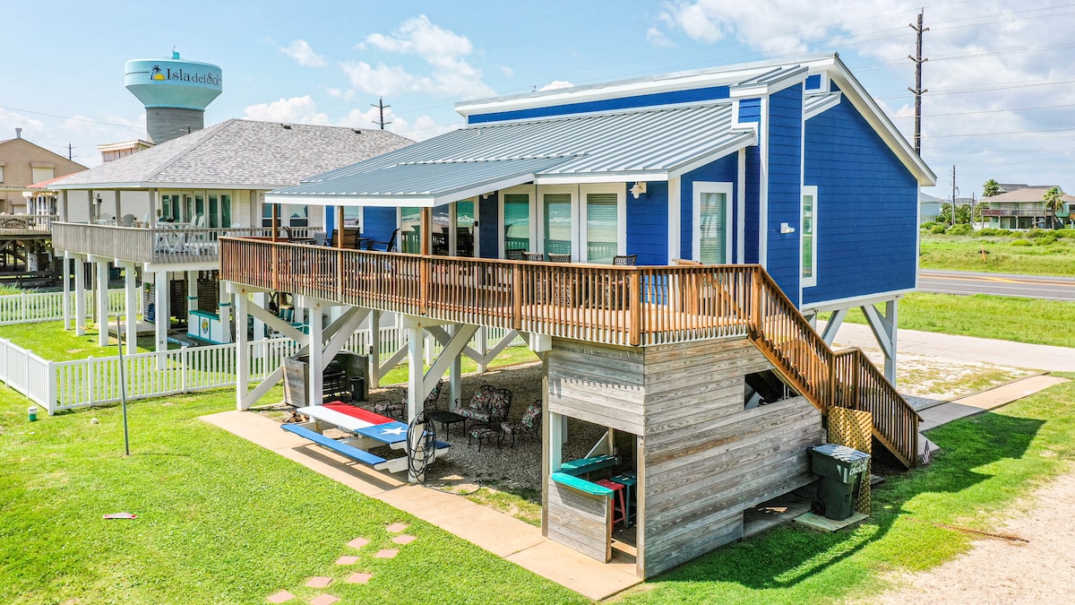 Come away to this amazing beach house in Crystal Beach with water views and walking distance to the beach. Outside, the property is all about lounging and entertainment, with a fire pit, hammocks, shady porches, sweeping balconies, a weber grill, and a ping pong table. Inside, you'll find 4 gorgeous bedrooms with a bonus kid-friendly sleeping nook, a spacious living area with fire place, and a well-stocked kitchen, perfect for families, friends, or couples. 5 min walk to the Beach