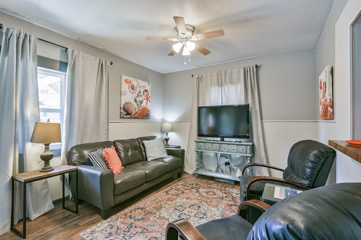 -Casita De Palmera- Relax on the lighted, palapa-covered deck with your coffee or cocktail! Family + pet friendly! Less than a half mile to Galveston's Historic Downtown area and a short 4 minute drive to the beach! Close to all of the fun, shopping, live music and restaurants on The Strand! -Fenced backyard -800+ MBPS Wifi -4 Smart TVs w/ Roku capability to stream with your accounts -Arcade & board games -Wood Grill -Beach towels & toys Close to cruise terminals & ONE block to cruise parking!