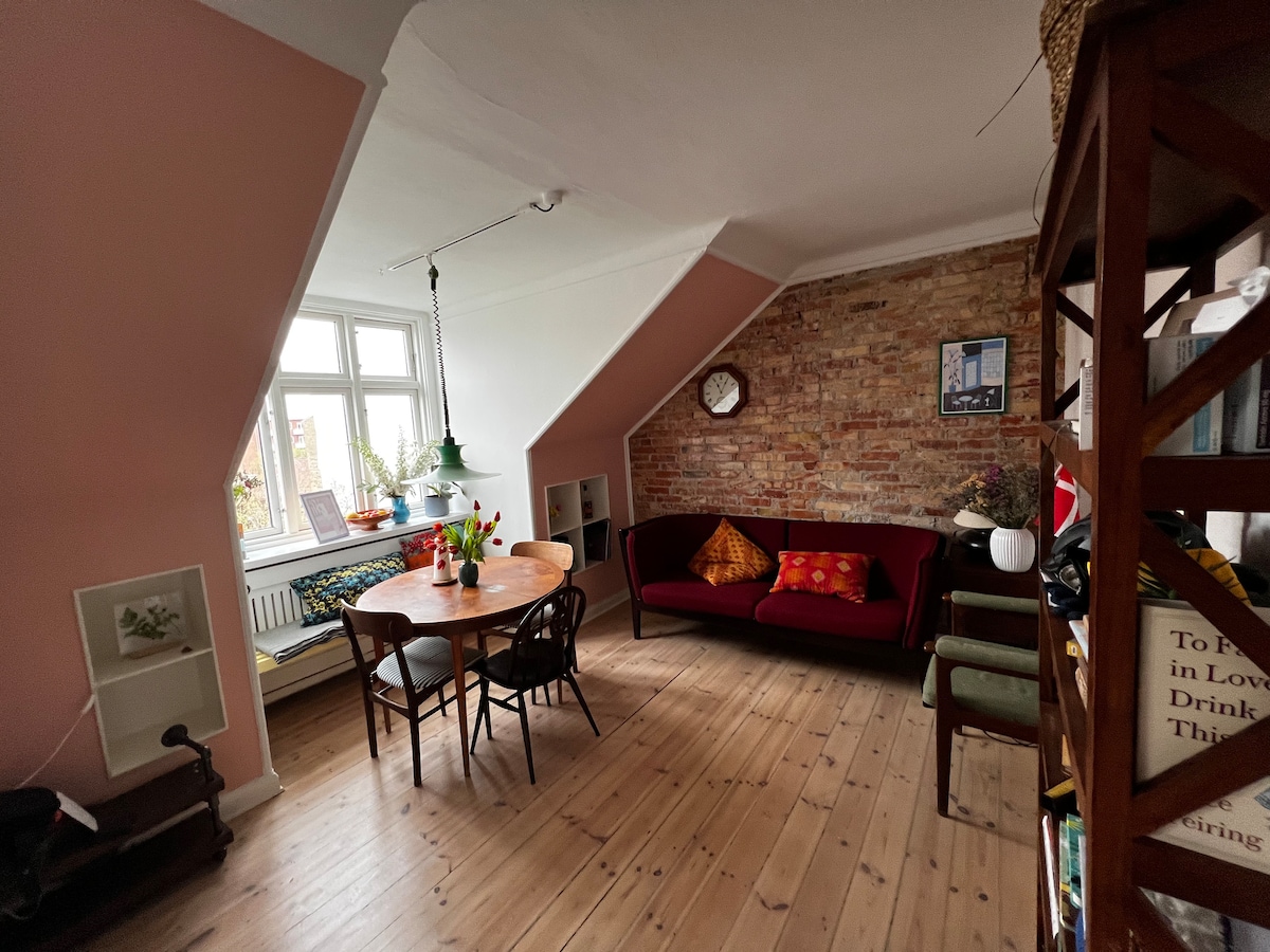 Flot 130 kvadratmeter 2-etagers lejlighed midt i København. STUEN To soveværelser og et badeværelse med badekar og bruser i et FØRSTE SAL Stort samtalekøkken med plads til 6 spisende gæster. To sammenhængende stuer, hvor der er skrivebordsplads i det ene - og sofa og fjernsyn i det andet. Moderne indretning i et ellers meget gammelt hus. Etagerne er forbundet af en vindeltrappe inde i lejligheden. Man kan fra køkkenet og toilettet se baggården, de gamle tage og Vor Frelser Kirkes tårn.
