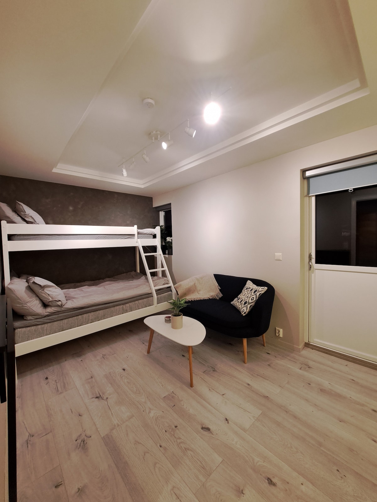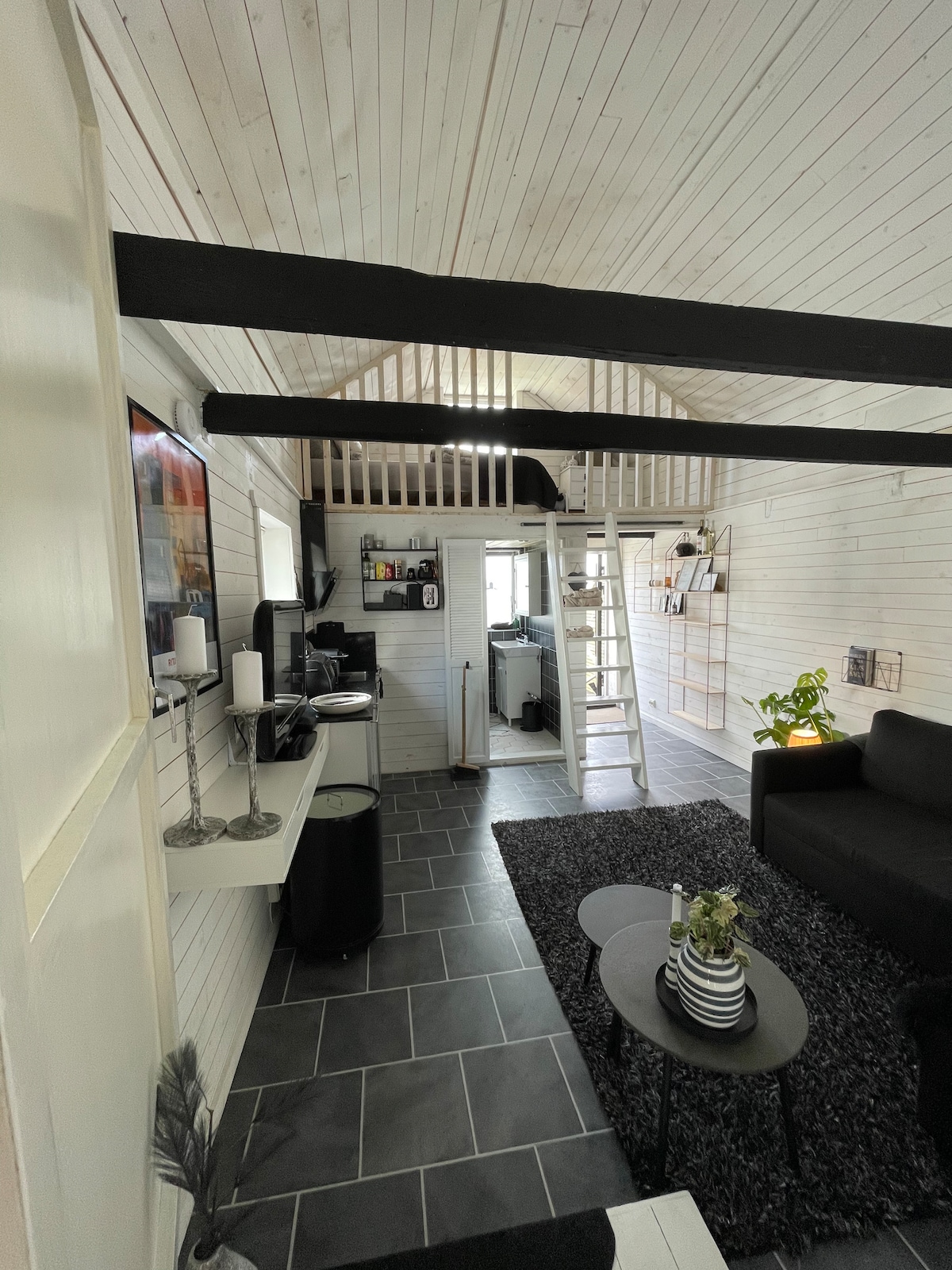 (Gratis parkering) aircondition/varmepumpe og gulvvarme. godt inneklima. Studioleilighet underkant av 30m². Sengen er en liten dobbeltseng 120x200cm nede og 75x200cm oppe. Gjestesengen kan slåes ut på gulvet og er 90x200cm. Velg mellom elektrisk oppblåsbar madrass eller feltseng. Kjøkken med det meste av utstyr. Dusjkabinett på bad. Stor sydvendt terrasse med paviljong og utemøbler. Fint sted til en hyggelig pris.