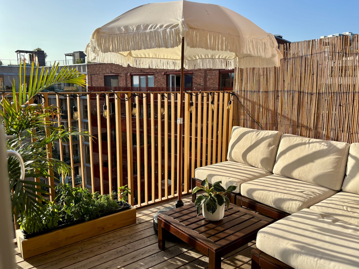 Enjoy breakfast in bed or at the bakery downstairs before a refreshing morning swim. The Nordic design creates a cozy vibe in this brand-new top-floor apartment with afternoon and evening sun on the private balcony. Just 5–10 min walk to everything Oslo offers – top restaurants, bars, cafés, the fjord and Oslo downtown. Spend sunny days with a book or drink in hand on one of six rooftop terraces in the building with sun from morning to evening and full view of the Bjørvika district.