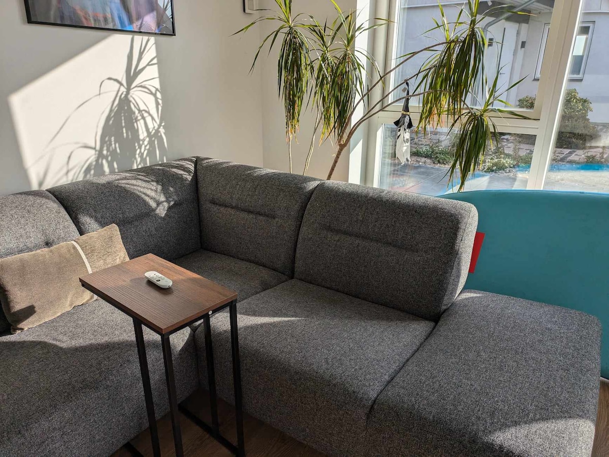 Annekset indeholder: 1 lille soveværelse med 1 dobbeltseng og 1 enkeltseng. 1 stue med 1 stor sofa, hvor man kan sove 1-2 personer. 1 lille tekøkken med køleskab, 2 kogeplader og mikroovn. 1 meget lille toilet, hvor der er bruser. Annekset skal sættes i stand, så det fremstår ikke super, men det fungere, og vi synes, det er hyggeligt at være derude. Vores have er “vild med vilje”, men vi har ikke helt fået den “tæmmet” endnu. (så det virker lidt rodet) Vi bor i huset ved siden af.