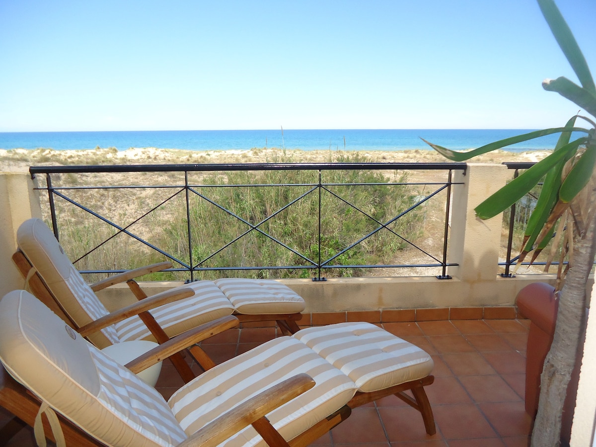 Bonita casa en urbanización Nueva Playa, en 1ª línea con acceso directo a estupenda y tranquila playa de arena. Tiene jardín, terraza, barbacoa y parking privado. Muy agradable. Toda equipada. Zonas comunitarias con piscina directa al mar y amplias zonas de césped. Para pasar vacaciones cómodas y tranquilas. Urbanización cerrada con conserje. Fantástica playa para amantes del windsurf, kitesurfing o wingfoil.