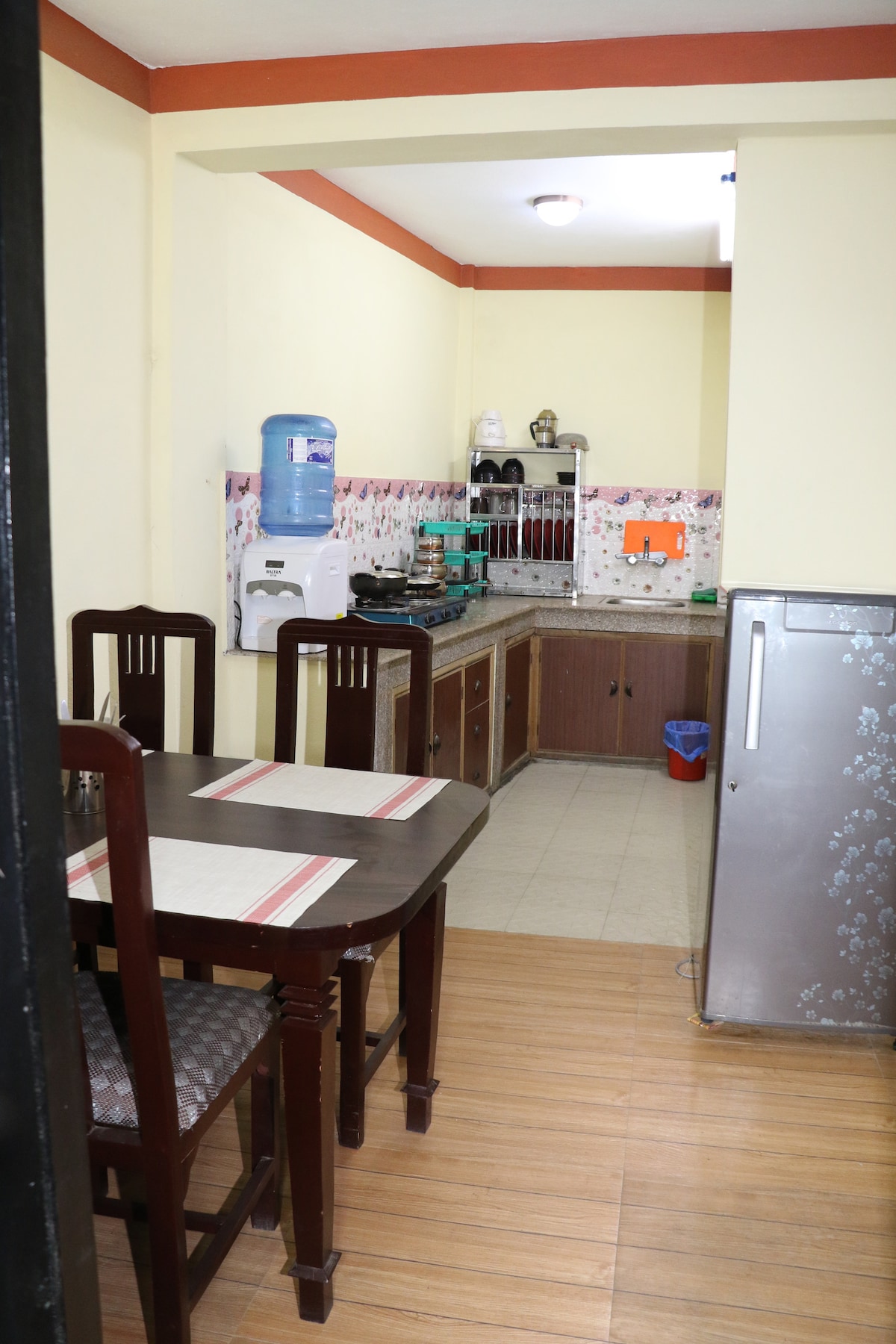 A Nepali boutique style building with traditionally hand made windows & doors as well as wooden floor, located 10 minutes walk from Thamel centre, a purely residential area with colourful houses around and warm people. It has one large bed room with one queen size bed & one single bed, two bath rooms/toilets, living room with TV & sofas and then an equipped kitchen/dinning room. The private terrace table with high Himalaya ( snow capped mountain) views, Working WiFi, hot/cold shower.